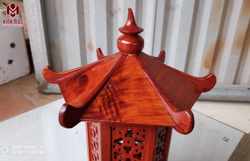Đèn được đóng trên gỗ hương ta. Hương thơm dịu nhẹ. Thiết kế sang trọng, cổ điển với hình mái chùa. Thân đèn hình lục lăng chạm trổ tinh xảo. Chân lùn, khiến cho cặp đèn thêm bề thế. Đèn lắp bóng quả nhót thông dụng. Dây điện dài 1,5m, gắn sẵn triết áp điều chỉnh độ sáng.