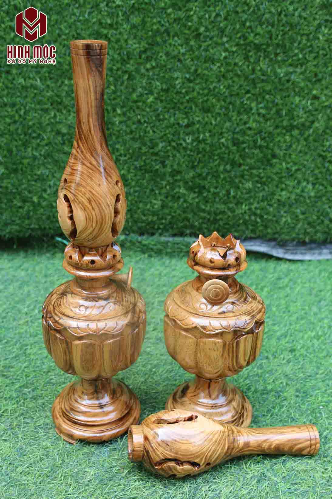 Đèn được thiết kế dựa trên mẫu đèn dầu truyền thống với thân đèn mở rộng, thân chạm họa tiết múi bầu bí. Bóng đèn thuôn dài. Đèn có đủ chi tiết chạm trổ như chiếc đèn dầu cổ điển. Đèn được đục trên gỗ gụ mật ta, gỗ đẹp, màu vàng đậm mật ong, vân xám đẹp, sang trọng.