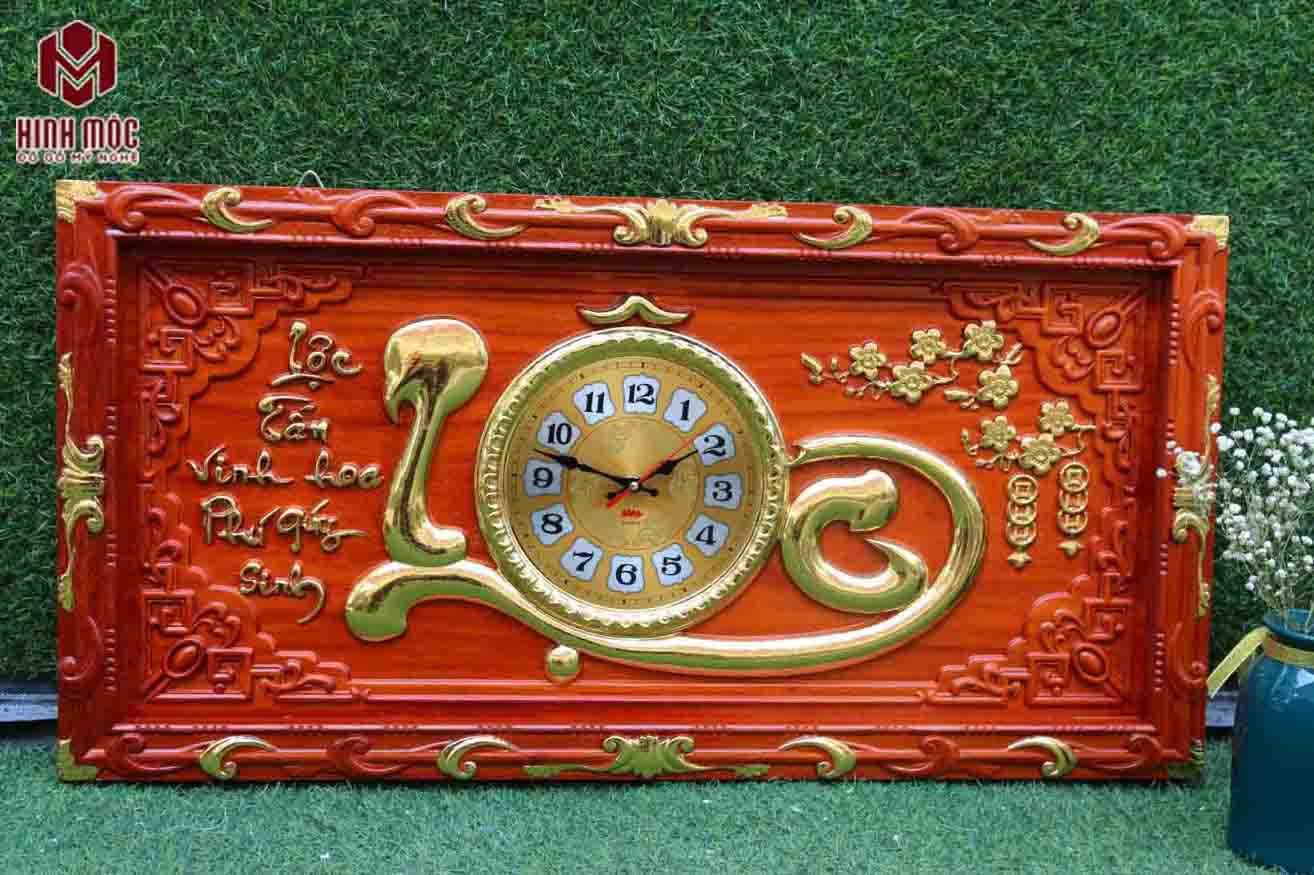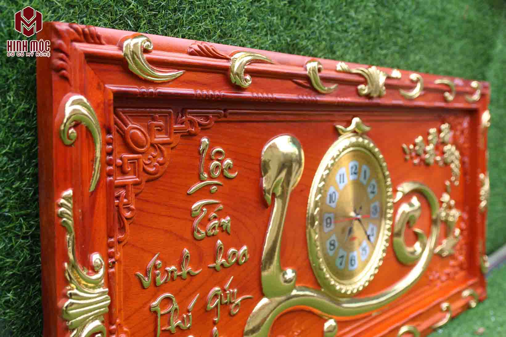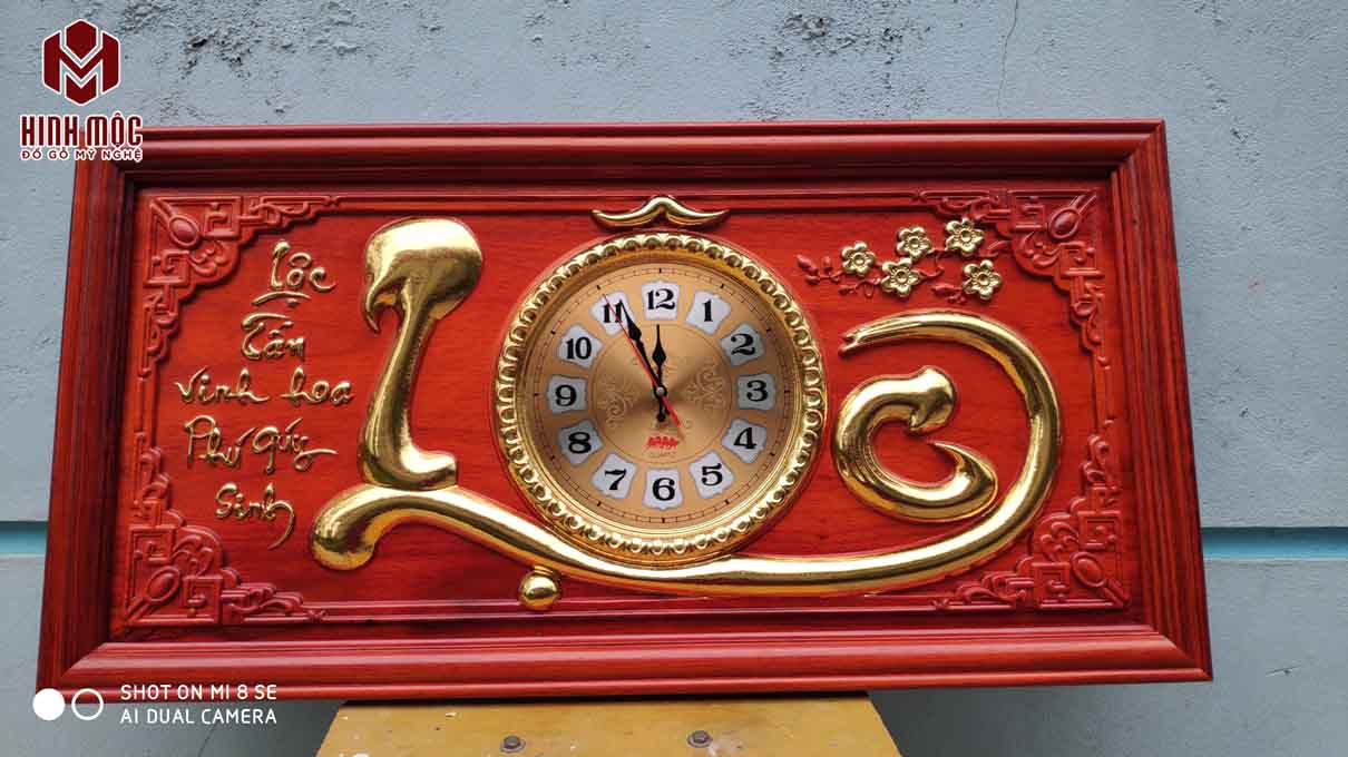 Quy cách: Đóng mộng gỗ chắc chắn. Đục nổi CNC chữ Lộc theo lối thư pháp Việt. Gắn đồng hồ điện tử. Sơn PU gỗ, mạ vàng theo yêu cầu.