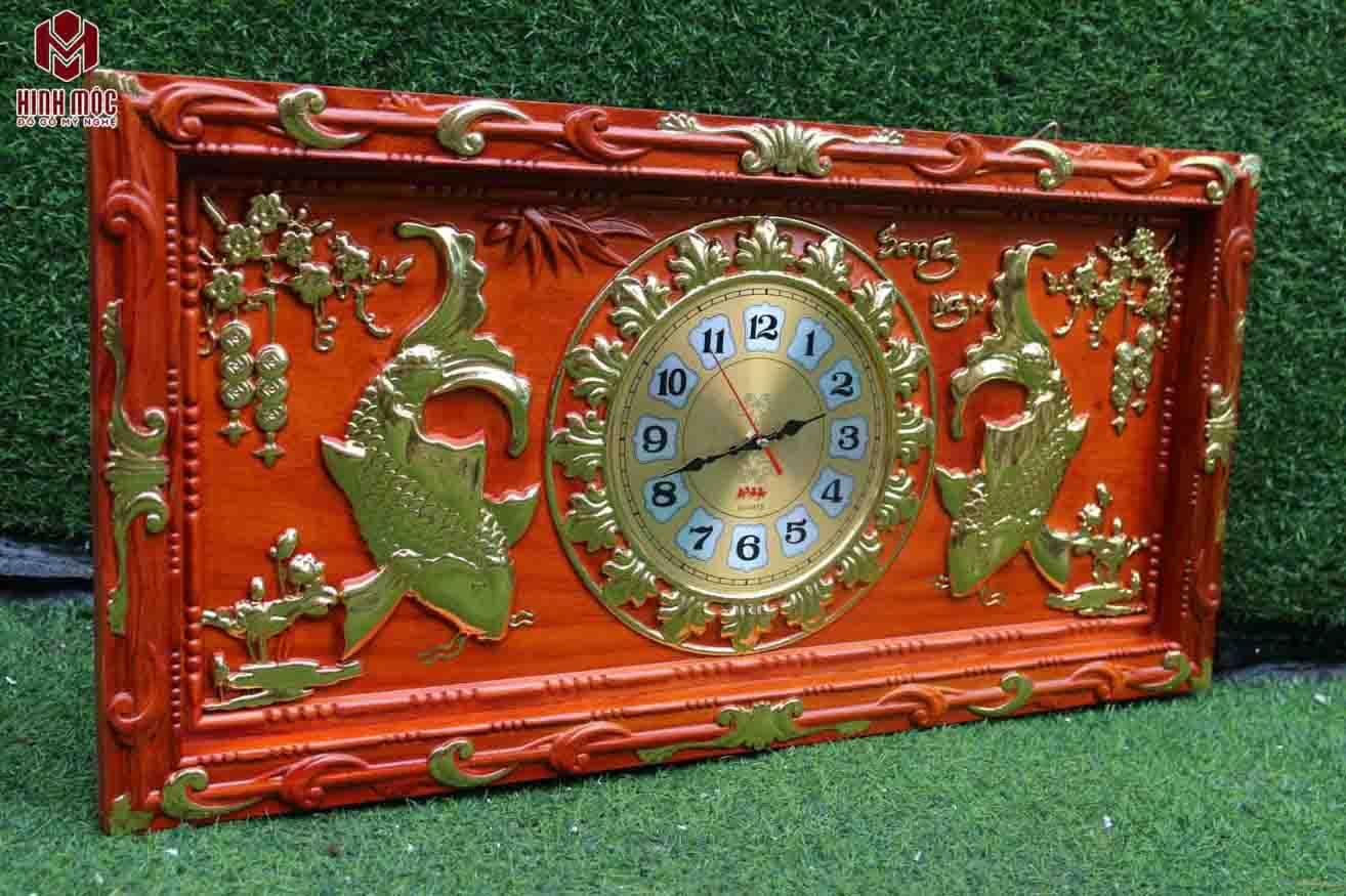 Đây quả thực được đánh giá là 1 chiếc đồng hồ gỗ treo tường rất đẹp. Đẹp bởi mang màu đỏ nâu tự nhiên của gỗ hương rất quý, sang bởi đồng hồ được đóng trên ván gỗ dày dặn, gỗ hương rất quý lại còn được mạ vàng cao cấp. Trung tâm của chiếc đồng hồ tranh gỗ này là hình ảnh đôi cá chép (song ngư) đang quây quần uốn lượn. Hình ảnh này gợi đến bức tranh dân gian quen thuộc Lý ngư vọng nguyệt - cá chép ngắm trăng.