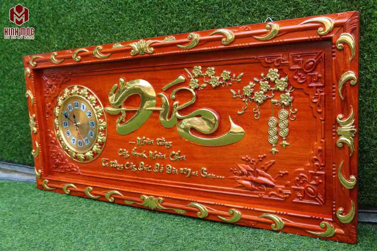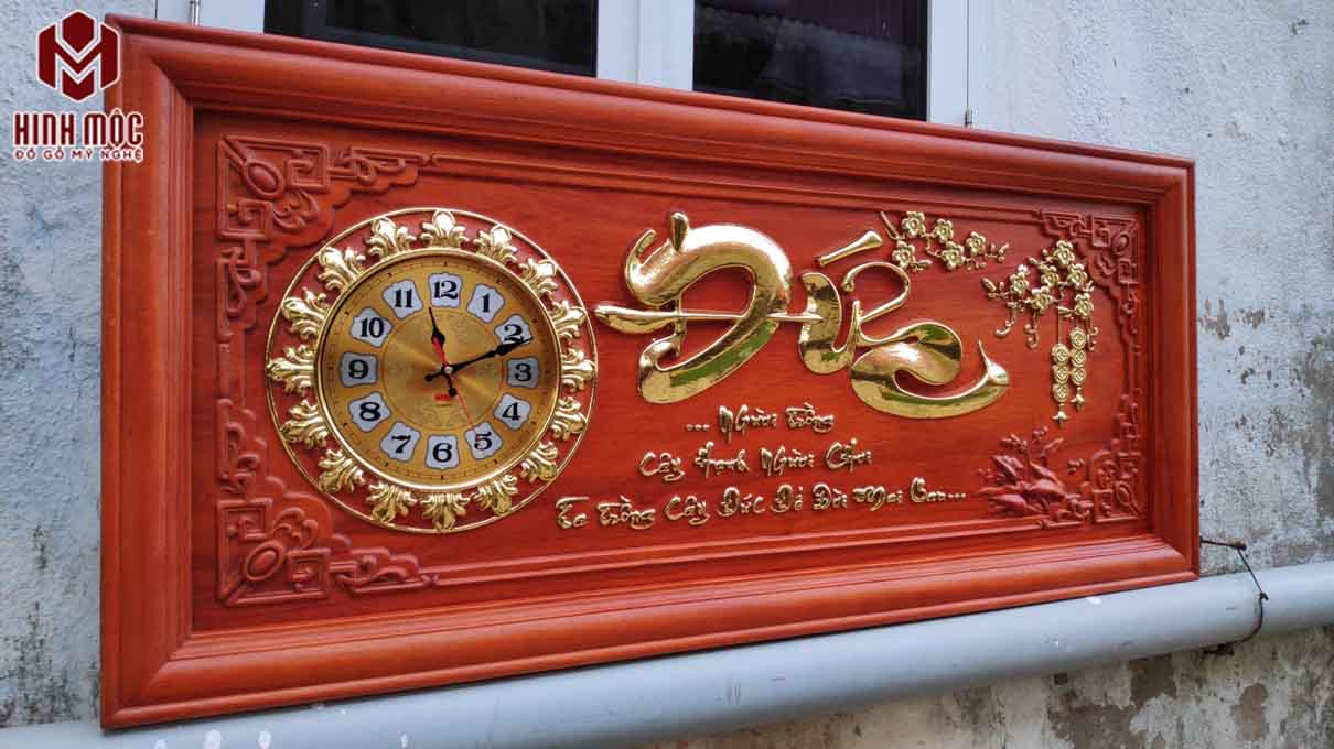 Đồng hồ đóng chắc chắn, gỗ dày dặn, ván dày 3cm, đục nổi 1cm, khung dày 4cm. Gỗ liền nạc, vân nhiều, không rác, không mấu mắt, nứt nẻ.