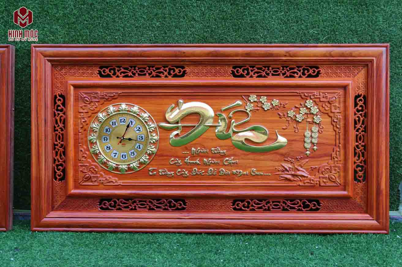 Đây xứng đáng được coi là 1 tác phẩm nghệ thuật điêu khắc gỗ đẹp. Với nội dung trung tâm là chức Đức điêu khắc nổi theo lối thư pháp Việt. Chất liệu gỗ hương tuyển chọn, đóng chắc chắn, sơn PU bóng mờ, mạ vàng 24K bằng công nghệ hiện đại. Sản phẩm được lắp máy điện tử, chạy bằng pin tiểu thông thường. Thời gian thay pin khoảng 6 tháng.