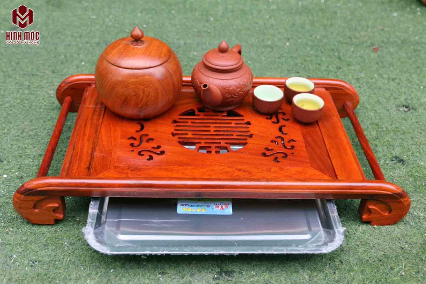 Khay được thiết kế mặt liền là nguyên 1 tấm ván gỗ hương ta xẻ mỏng. Trên mặt khay, lộng thủng họa tiết chữ Thọ vừa là để trang trí vừa là để nước trà thải ra được chảy xuống khay inox phía dưới.