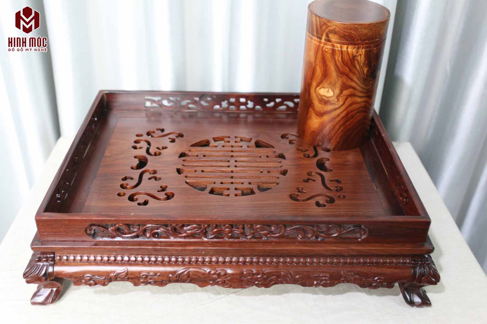 Khay đục gỗ cẩm lai được thiết kế tiện dụng, phù hợp với quy mô thưởng trà gia đình. Mặt khay là tấm ván gỗ liền khối, chạm chữ Thọ. Diện tích sử dụng là 40*30cm. Chung quanh được bo bằng đường viền chạm họa tiết hoa dây. Phần chân khay trà được chạm dáng chân sập, đầu rồng, dáng quỳ sang trọng. Phần rộng nhất của chân khay là 45*32cm. Dưới có lót tấm inox cao cấp hứng nước thải.