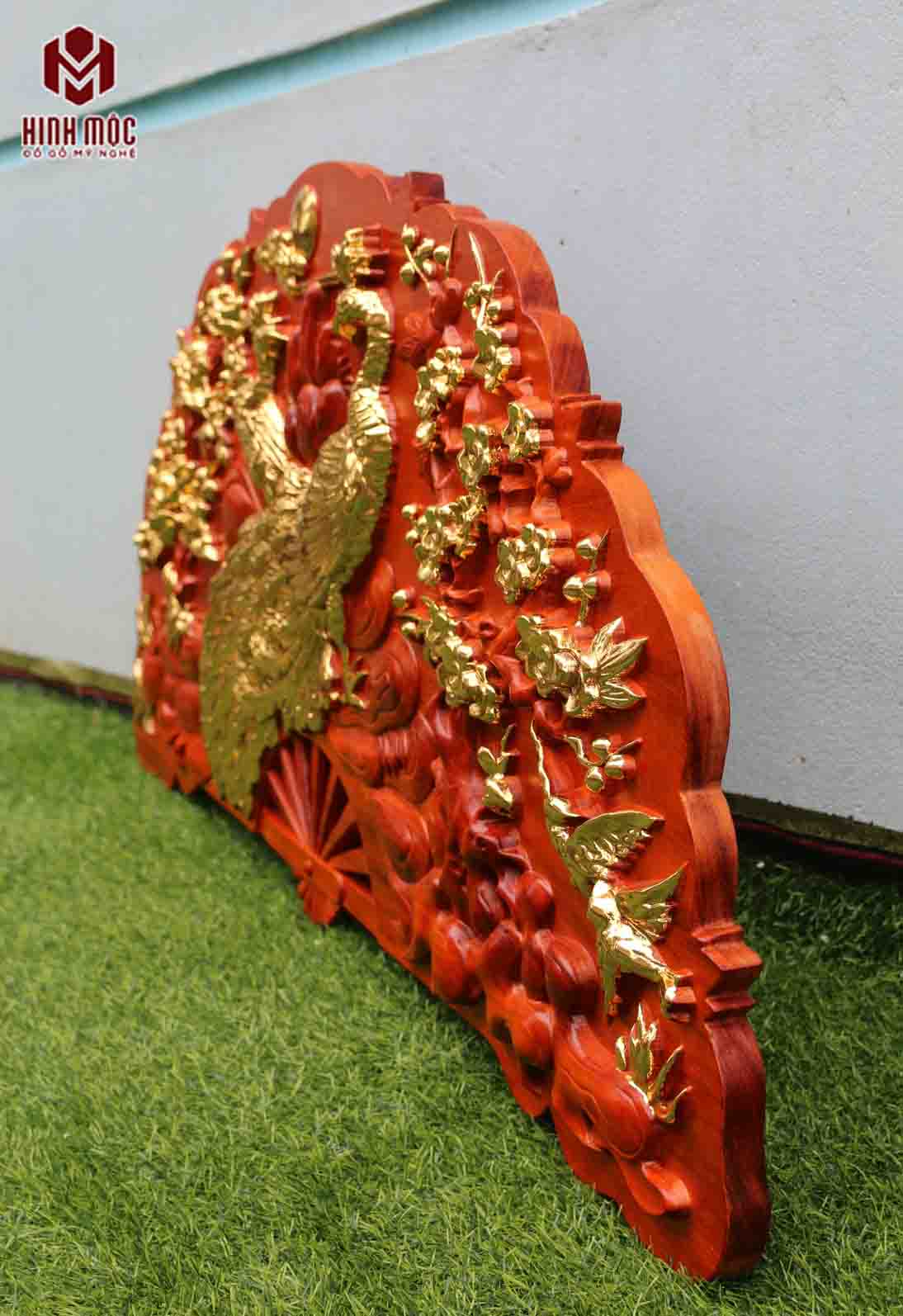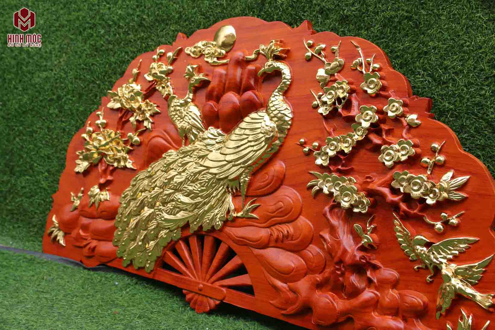 Quạt đục hình đôi chim công trống mái, bên cạnh là bụi hoa phù dung nở rộ. Hình ảnh này là 1 hình ảnh vui tươi sinh động. Hơn nữa, đây lại mang ý nghĩa hoan hỉ, mừng cho tình nghĩa vợ chồng gắn bó dài lâu. Quạt đục trên gỗ hương liền khối, phần đục nổi 1cm. Đục sắc nét, gia công kĩ càng. Sơn PU và mạ vàng 24K cao cấp.