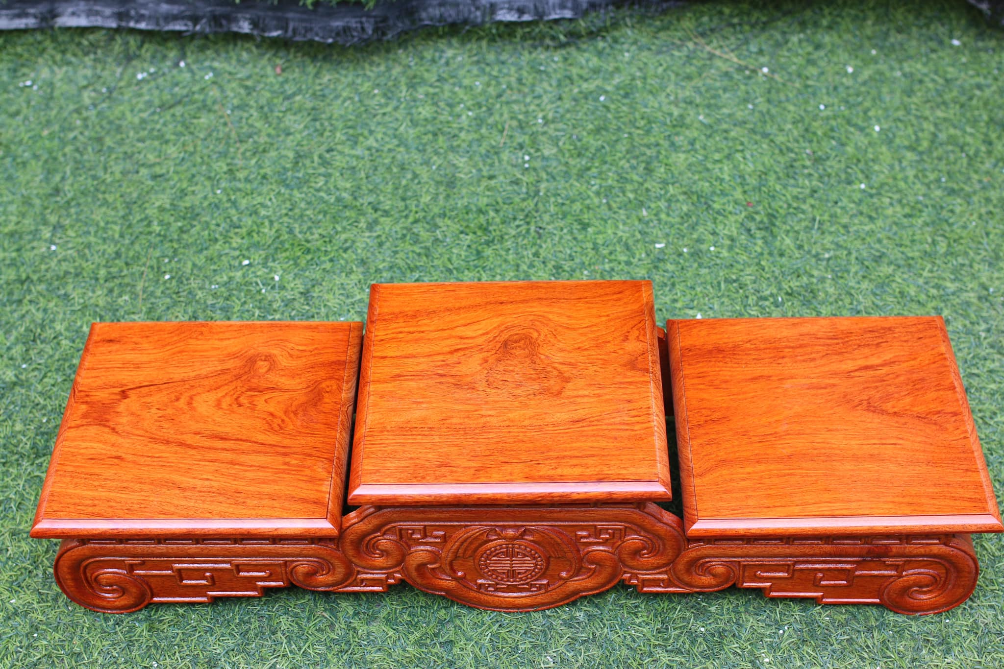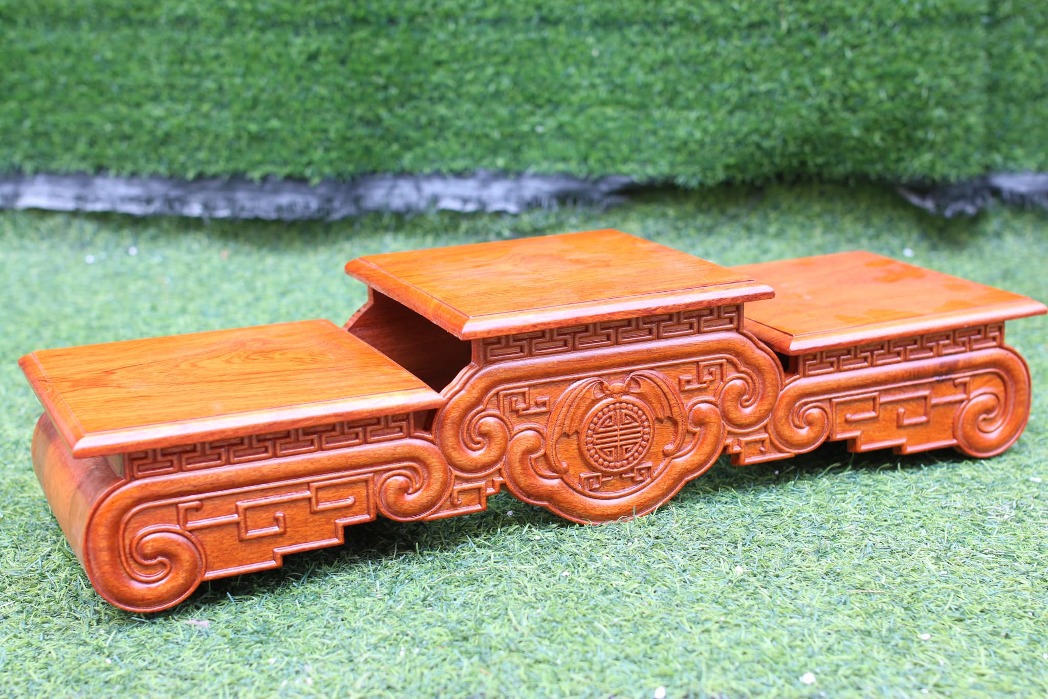 Chúng tôi giới thiệu tới bạn mẫu tam cấp để bát hương bằng gỗ hương đá rất đẹp, bền và ý nghĩa ở trên. Tam cấp được làm từ gỗ hương đá nhập khẩu, gỗ đẹp, màu đỏ nâu tự nhiên, vân nổi cuồn cuộn. Phần mặt và yếm tam cấp là ván gỗ liền tấm, sang trọng và giá trị. Ván dày 0,5cm đảm bảo chắc chắn, lâu bền. Thiết kế lối chân cuốn cổ điển và linh thiêng, phần giữa chạm họa tiết cánh dơi bám chữ Thọ truyền thống.