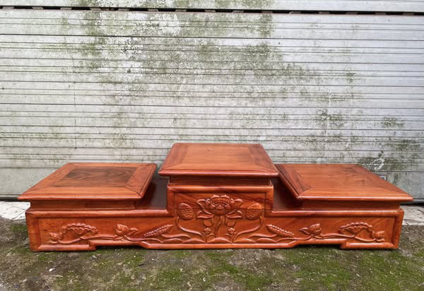 Đây là mẫu tam sơn đặt bát hương giá rẻ bởi sản phẩm là mặt ghép. Phần yếm liền, chạm họa tiết hoa sen truyền thống. Mẫu tam sơn này có chiều cao phần cấp cao nhất là 15cm, 2 cấp bên trái bên phải cao 10cm. Cả bộ dài 60cm.