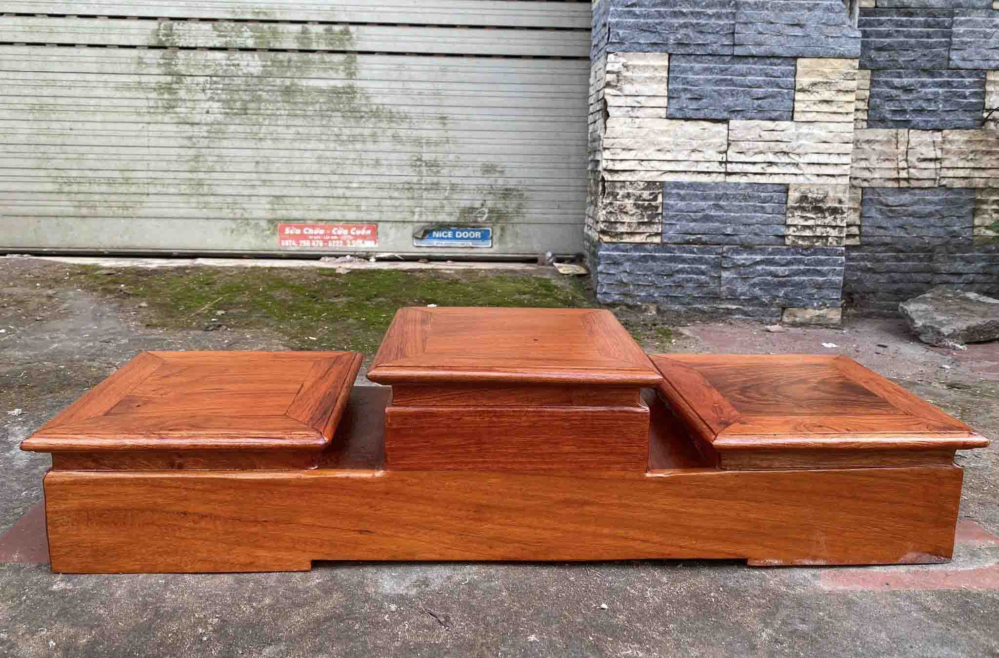 Tam cấp đóng trên gỗ hương đá nhập khẩu. Đóng chắc chắn, yếm liền. Mặt được ghép bởi 4 phần gỗ khác nhau, ghép khít, miếng ghép đều màu. Các phần kết nối được dán keo công nghiệp chất lượng cao. Sản phẩm phù hợp để đặt mẫu bát nhang cỡ trung bình và nhỏ, đường kính bát hương từ 18cm trở xuống.