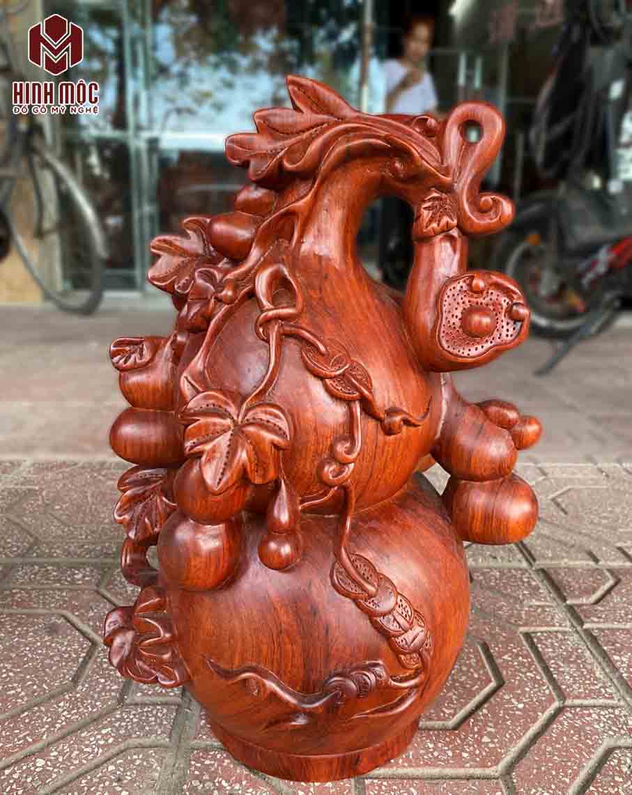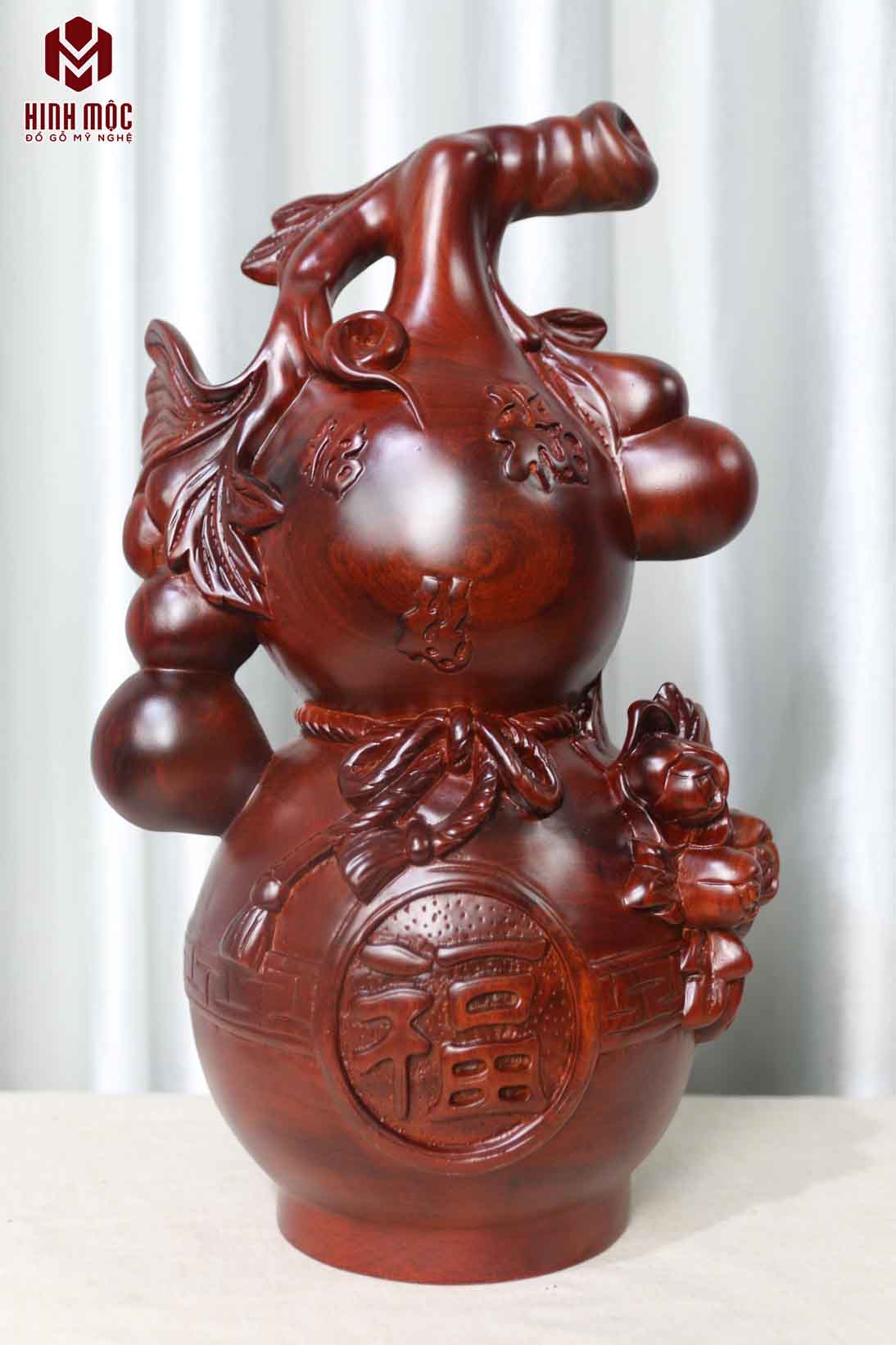 Đây là mẫu hồ lô được cực nhiều người lựa chọn bởi ý nghĩa vẹn tròn của nó. Trái hồ lô này có nhiều kích thước khác nhau, cao 30, 40 và 50cm, đục trên gỗ hương ta (hương Gia Lai). Sản phẩm đẹp, hài hòa, cân đối. Các tiêu chí về chiều cao, chiều ngang đều nằm trong khung đỏ tài lộc Lỗ Ban. Gỗ hương ta tuyển chọn, gỗ liền nạc, vân nhiều xoắn xuýt, mùi thơm dịu nhẹ. Hình trái đào, hoa hồng và chữ Phúc trên bình hồ lô gỗ này đều được gia công với sự sắc nét và tinh xảo rất cao.