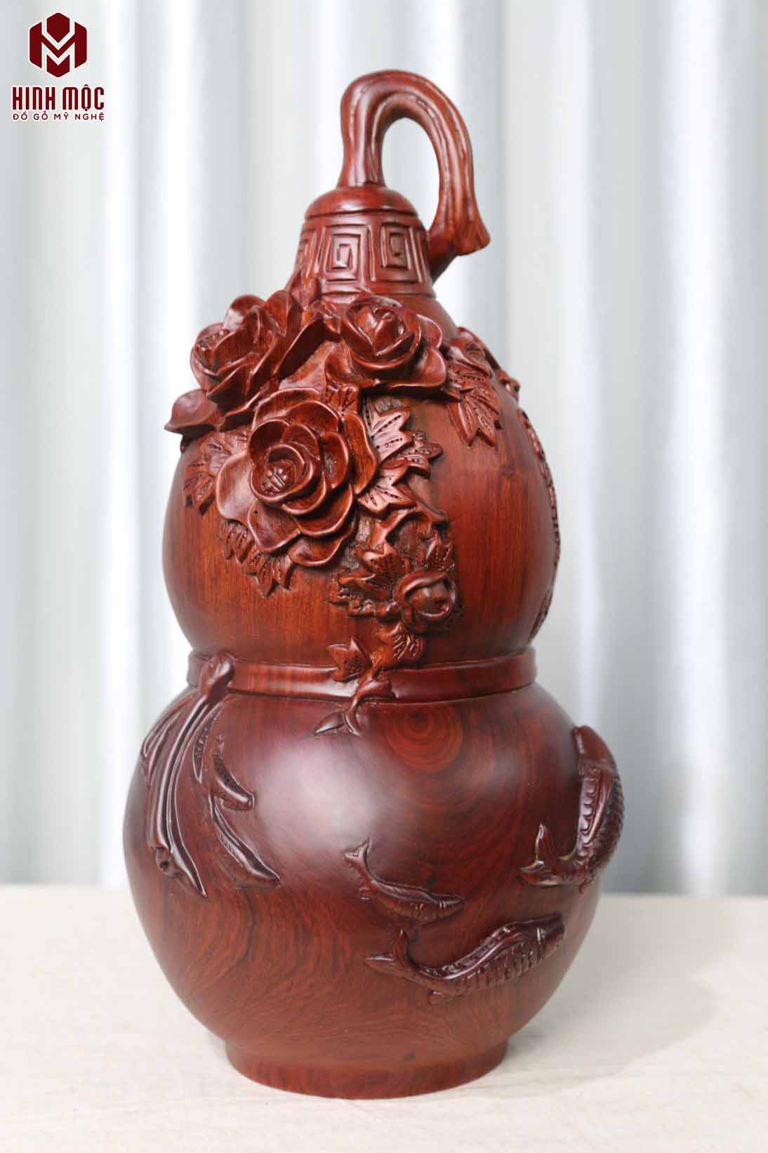 Cùng chung 1 kiểu dáng kết cấu với chiếc hồ lô hoa hồng, hồ lô cá cũng được đục trên gỗ hương ta. Chiều cao 30, 40 hoặc 50cm. Hồ lô có cổ bình thon nhỏ, miệng loe, thân bình nở rộng. Trên thân bình đục hình ảnh hoa hồng và đàn cá chép tung tăng bơi lượn. Hồ lô cá chép mang ý nghĩa phong thủy tài lộc, trưng tại phòng khách, quầy giao dịch, thu ngân... để thu hút tài lộc, vượng khí... Sản phẩm có chung giá với hồ lô hoa hồng. 2,5 triệu cho mẫu cao 30cm, 3,2 triệu mẫu cao 40cm và 5,5 triệu cho chiếc hồ lô cao 50cm.