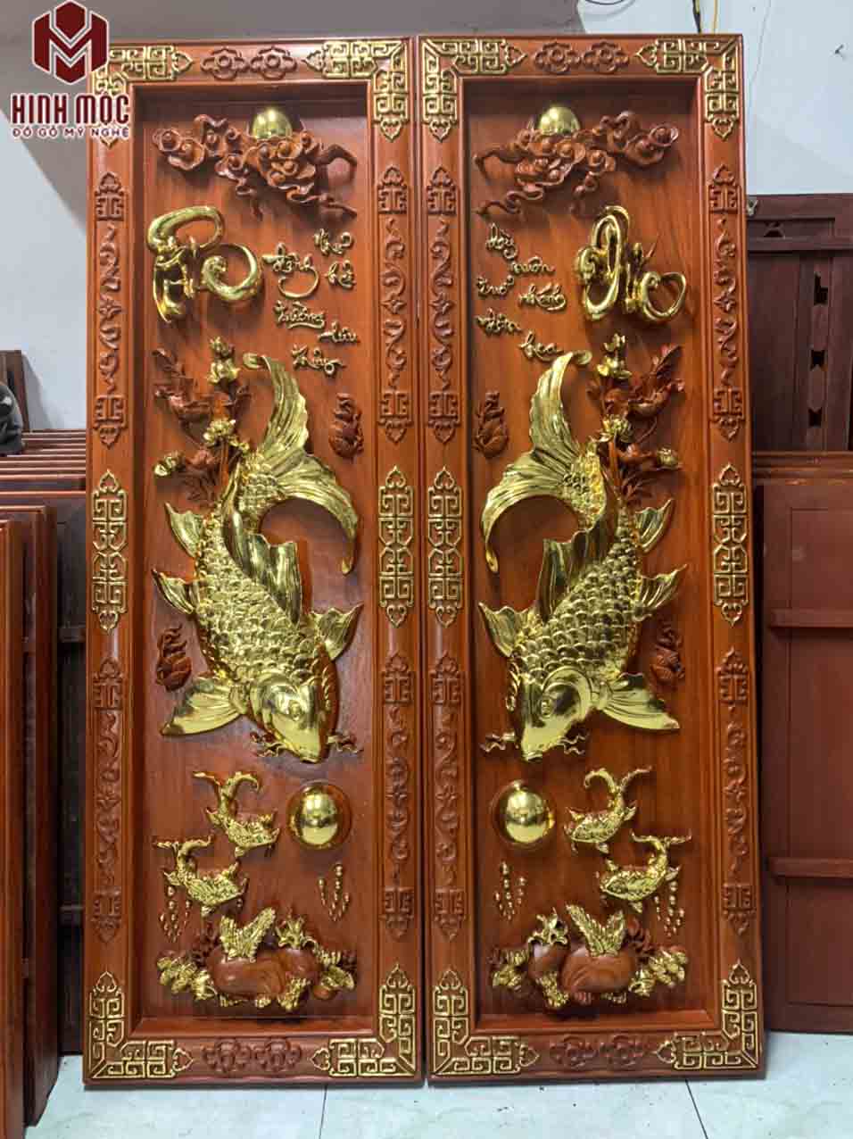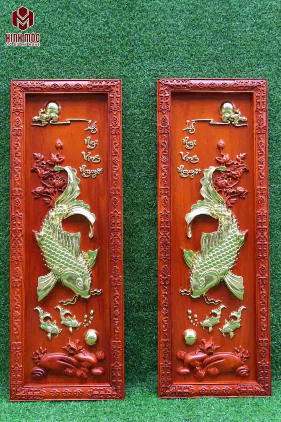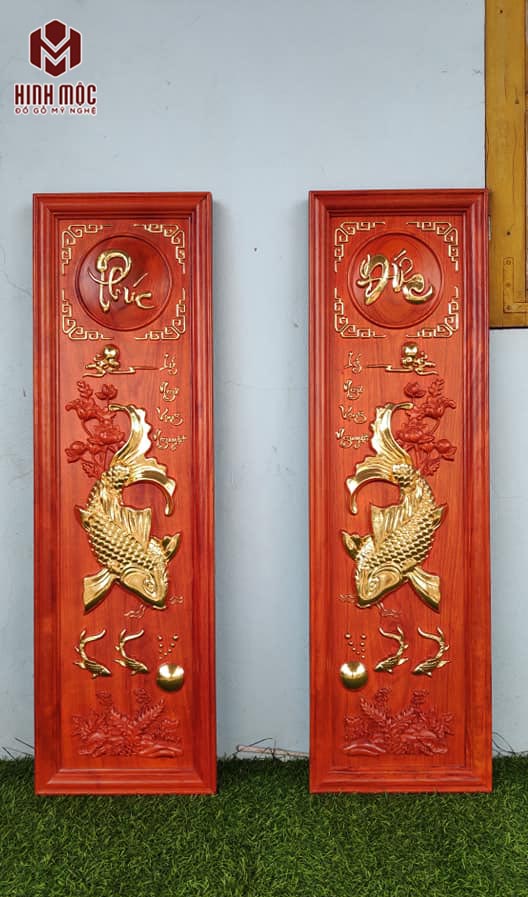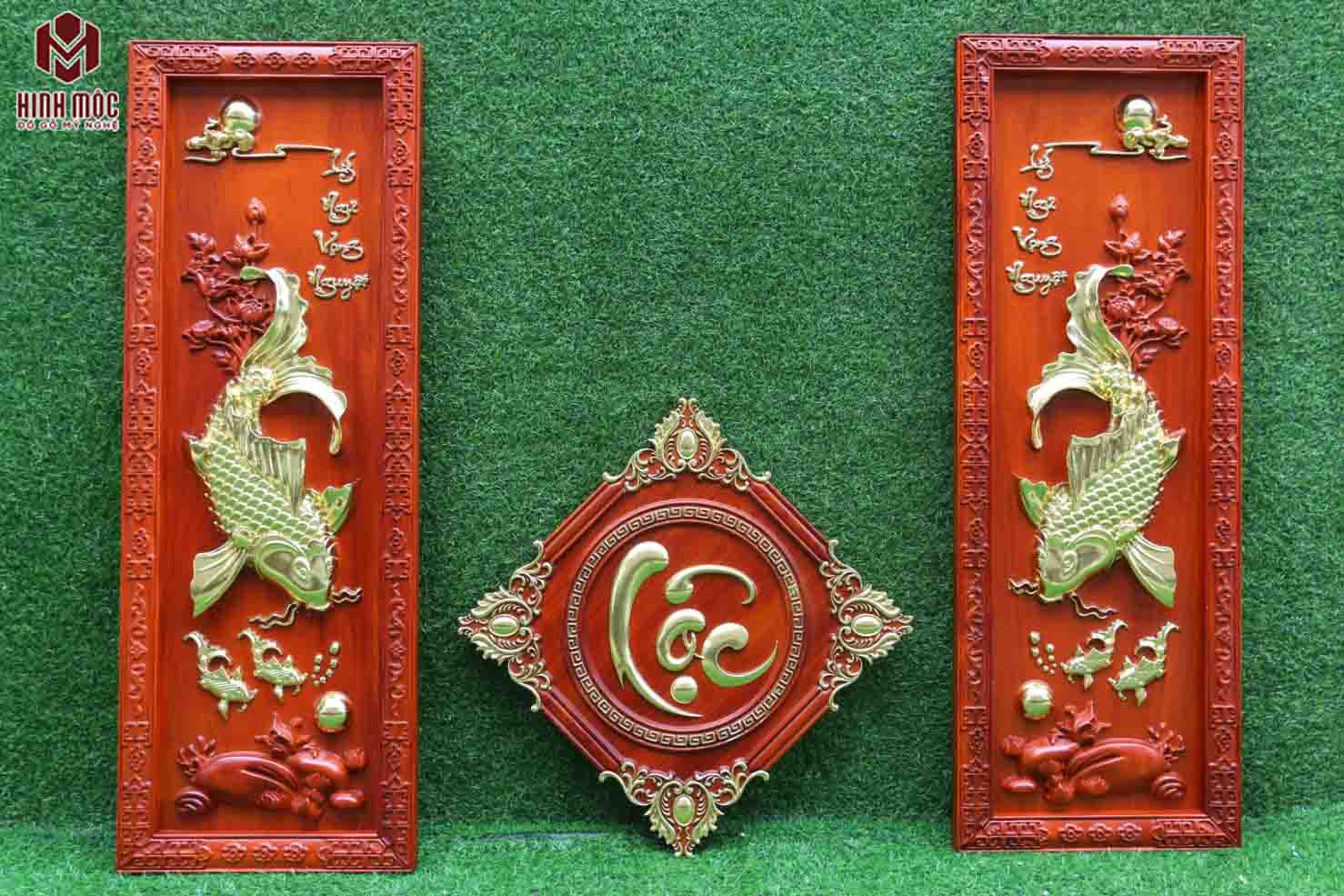 Đây là bộ tranh được nhiều người lựa chọn bởi vẻ đẹp và sự hợp lý của nó. Tranh dài 1,07m, rộng 37cm, ván dày 4cm. Đục nổi đôi cá chép 3cm. Phần vây cá, râu cá... được tỉa tay, đục lối kênh bong. Sơn pu hiện đại, mạ vàng cao cấp. Phần khung tranh dày 5cm, triện khung họa tiết chữ Vạn nhà Phật rất cầu kì. Tranh cũng được đục trên gỗ hương đỏ Nam Phi tuyển chọn. Bộ này đang được bán với giá 3,5 triệu đồng 1 bộ.