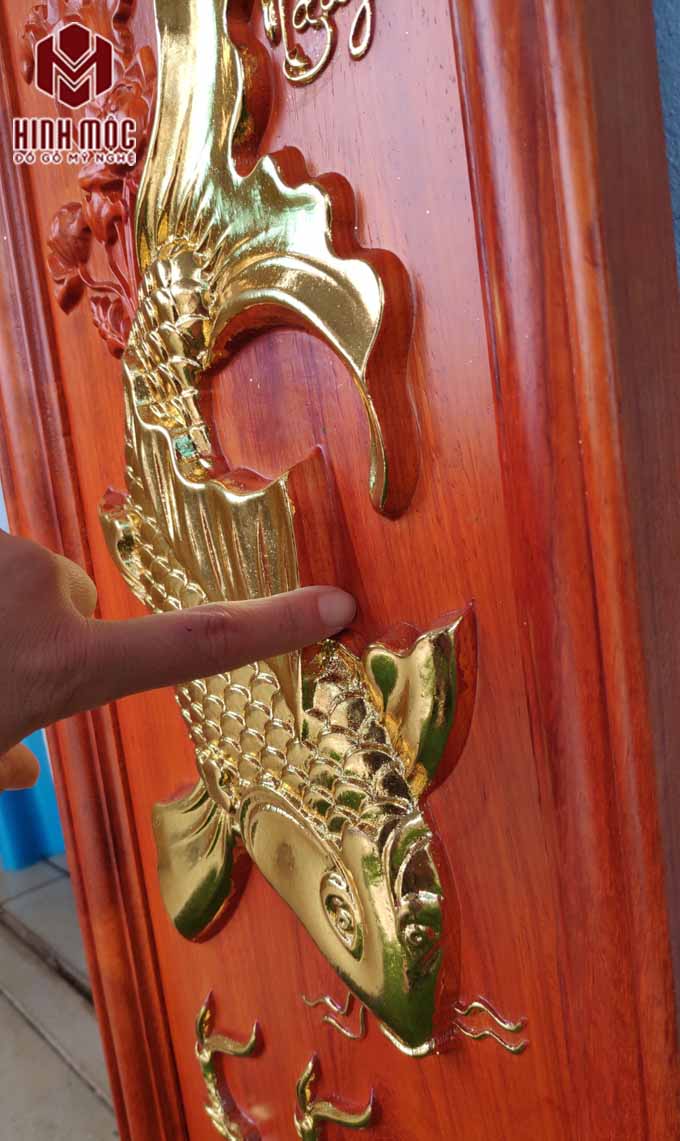 Tranh gỗ cá chép trông trăng giá rẻ còn bởi tranh được đục CNC hoàn toàn. Đục máy xong, chà lại bằng máy chà giấy ráp, sau đó phun sơn lót và sơn PU, mạ vàng theo yêu cầu. Nhờ đó đỡ được công thợ, giảm được giá thành sản phẩm.