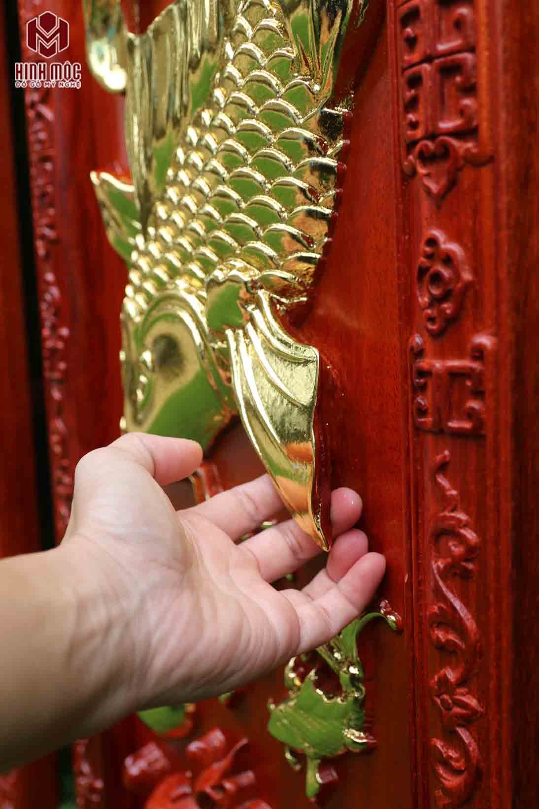 Con cá chép được đục nổi 3cm so với mặt ván gỗ, phần vây cá, mang cá được tỉa thủ công theo lối kênh bong, sắc nét và tinh xảo. Những phần màu vàng là được mạ từ lá vàng 24K công nghệ Đài Loan, đảm bảo bền vững cùng năm tháng, không nứt nẻ, co ngót, xuống màu...