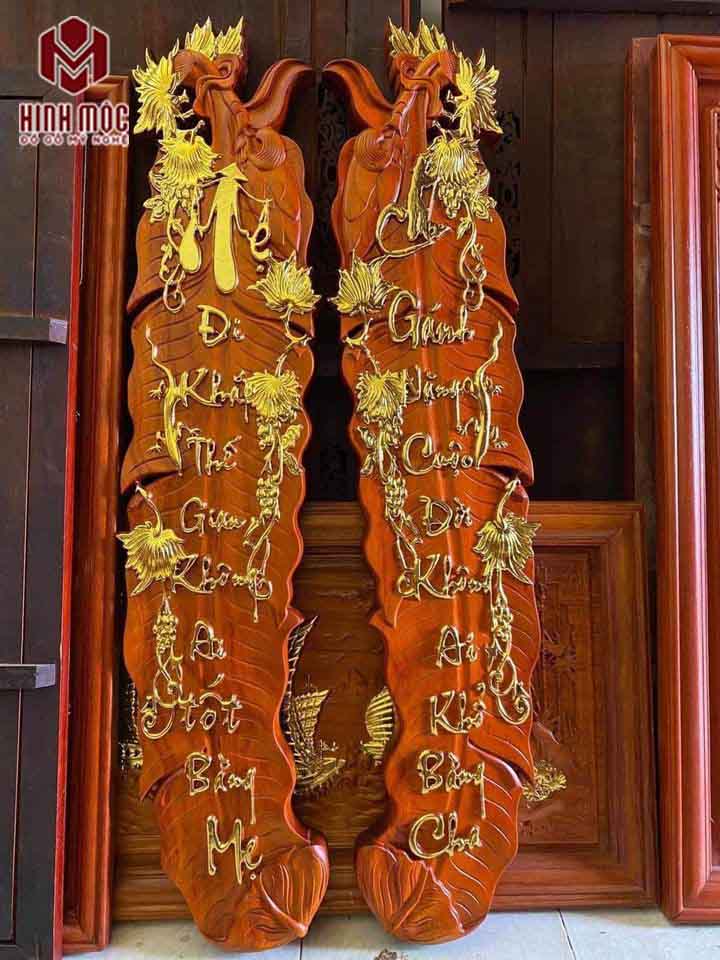 Bộ tranh câu đối lá chuối chữ cha mẹ gỗ hương ở trên nhìn mềm mại, nhưng lại là sản phẩm của máy đục CNC hiện đại. Tranh dài 1,07m phần rộng nhất là 25cm, dày 3cm. Sơn PU bóng mờ, mạ vàng 24K theo yêu cầu.