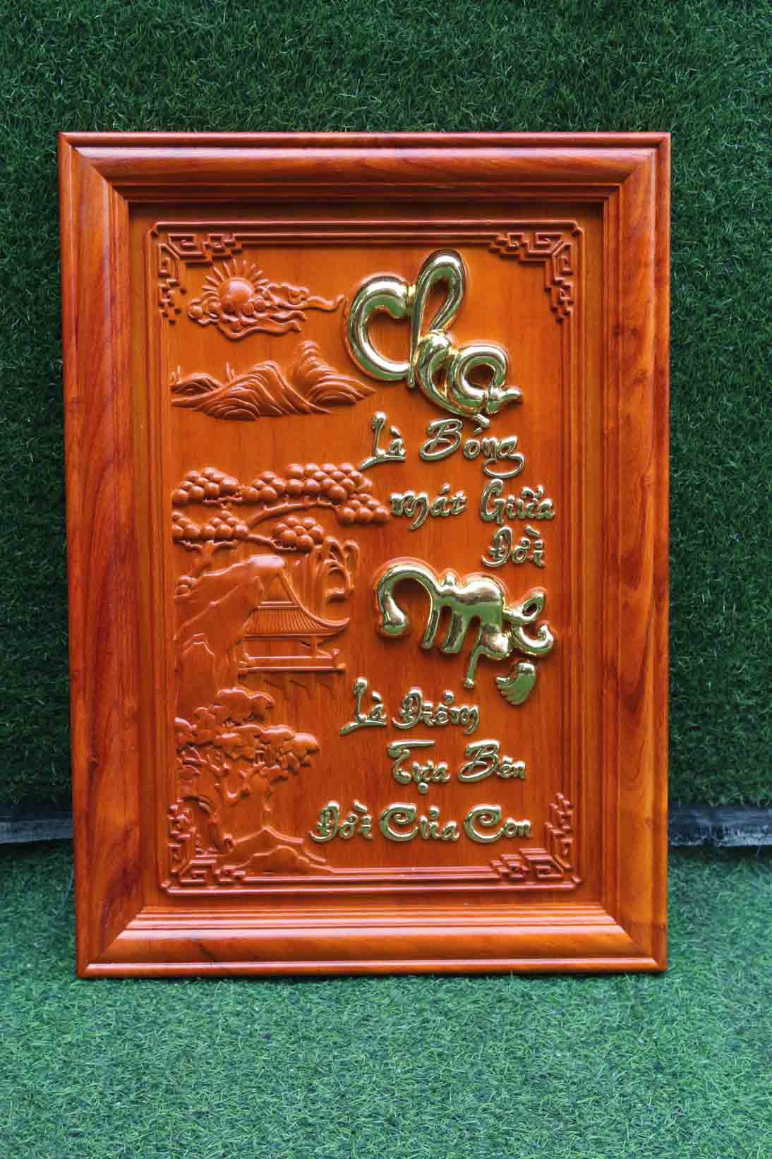Đa số các mẫu tranh chữ cha mẹ trên thị trường gồm có 2 tấm gỗ treo đối xứng với nhau. Một bức chữ cha và 1 bức chữ mẹ. Tấm tranh gỗ chữ cha mẹ ở đây lại được đục trên cùng 1 tấm gỗ. Trên đó đục nổi cả 2 chữ Cha - Mẹ kèm theo đôi dòng đề từ xúc động: "Cha là bóng mát giữa đời - Mẹ là điểm tựa bên đời của con". Bức tranh được thiết kế từ bản vẽ độc quyền, đục bằng máy đục CNC hiện đại. Sửa tay kĩ càng, sắc nét sau đó sơn bóng PU và mạ vàng theo yêu cầu.