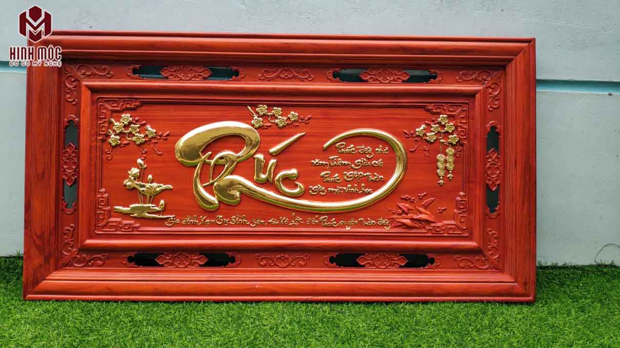 Tranh chữ phúc thư pháp gỗ có chiều dài là 1,27m, chiều rộng là 67cm, ván dày 3cm, khung dày 4cm. Đục nổi chữ Phúc hơn 1cm so với mặt ván gỗ. Bạn có thể lựa chọn chỉ sơn PU để khoe được đường vân thớ gỗ hoặc mạ vàng cho thêm phần long lanh, bóng bẩy.