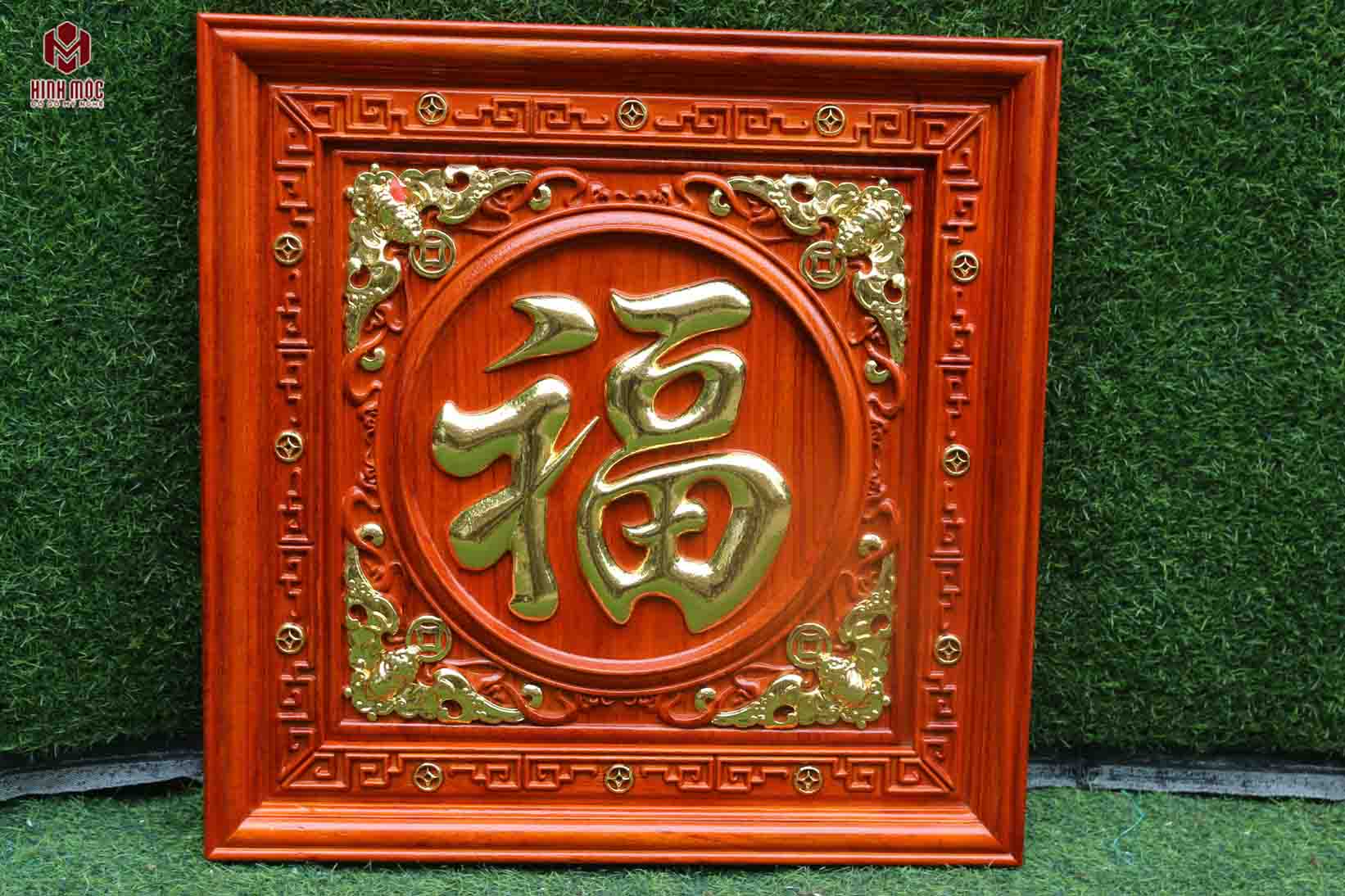 Cùng với nhiều mẫu tranh gỗ chữ thư pháp khác, tranh thờ chữ Phúc được đóng trên gỗ hương huyết Nam Phi. Tranh hình vuông, mỗi cạnh dài 61cm theo số đỏ Lỗ Ban. Khung dày 4cm, thân tranh dày 2,5cm, gỗ nạc, sơn son thếp vàng cao cấp. Đục máy, sửa tay sắc nét, tinh xảo. Nội dung của bức tranh là chữ Phúc tiếng Hán (chữ Nho). Phúc nghĩa là may mắn, thuận lợi, hạnh phúc, bình an - Đó là chữ tốt đẹp mang ý nghĩa bao trùm. Rất phù hợp để treo tại phòng thờ, phía bên trên ban thờ gia tiên.