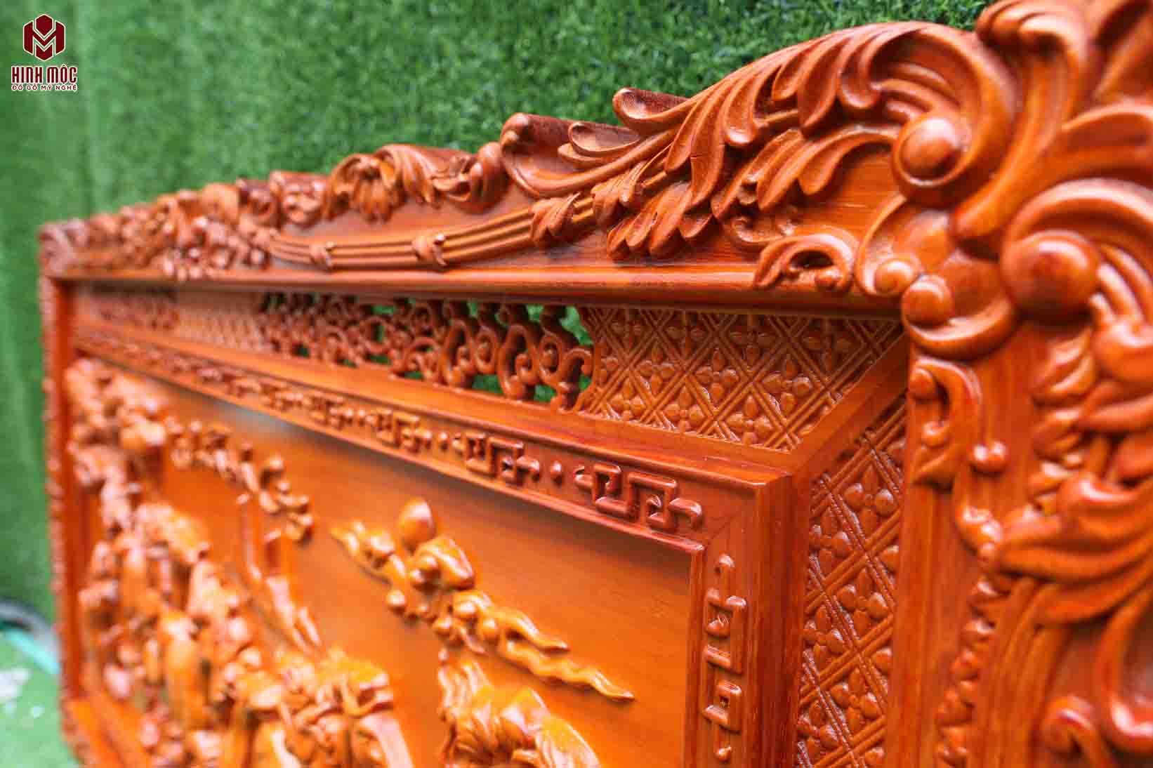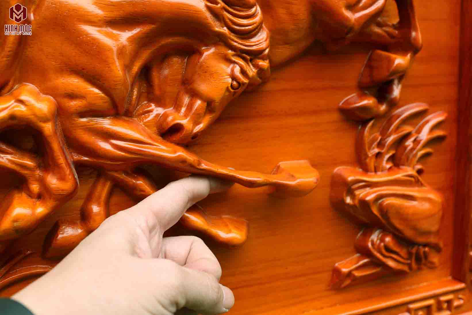Tranh được đục trên khối gỗ hương đỏ Nam Phi nhập khẩu. Gỗ đỏ đẹp, vân nhiều, màu tự nhiên. Gỗ đẹp liền nạc, cam kết không rác, không nứt nẻ cong vênh. Đục CNC hiện đại, móc lại thủ công, nhiều chi tiết kênh bong sắc nét, sạch sẽ. Tẩy gỗ kĩ càng, sơn PU bóng mờ cao cấp.