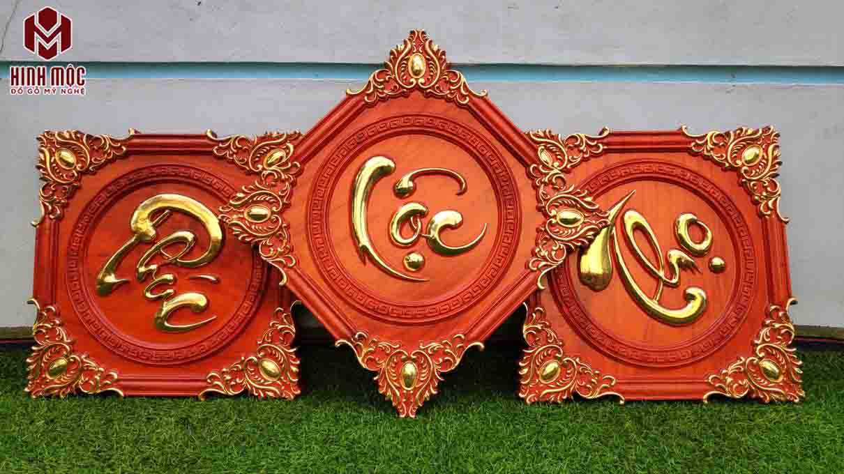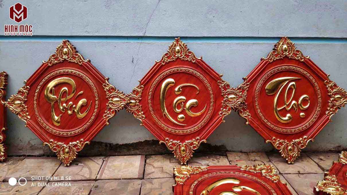 Bộ này vuông 45cm gỗ hương đỏ. Khách yêu cầu mạ vàng chỉ 3 chữ Phúc - Lộc - Thọ