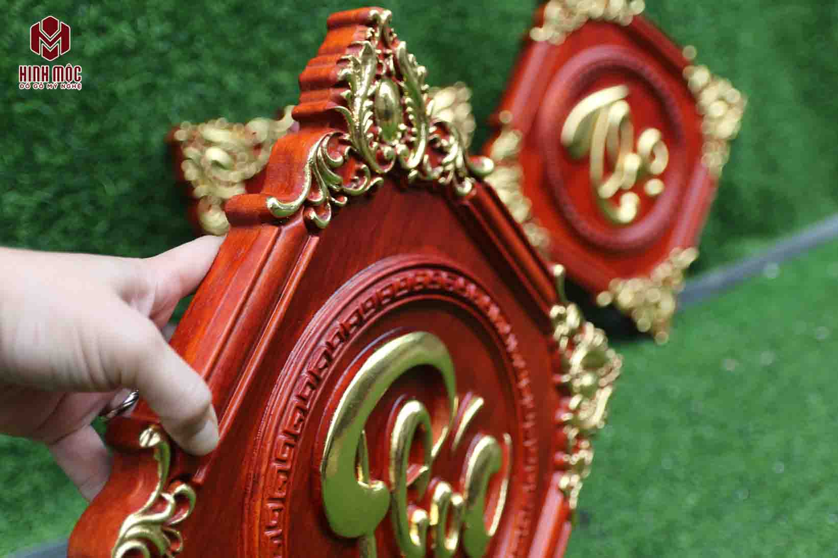 Đục CNC hiện đại, gỗ đẹp liền nạc, vuông 4 cạnh là 35cm, đường chéo 45cm. Sơn PU, mạ vàng cao cấp. Phù hợp treo tại phòng thờ, phòng khách nhỏ.