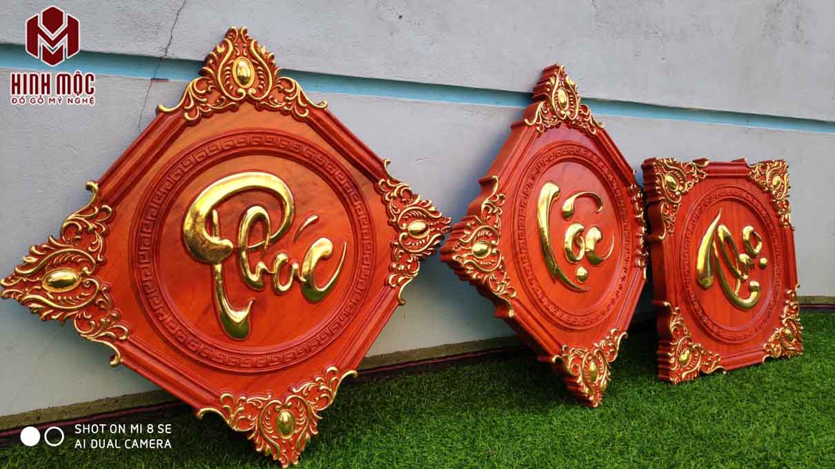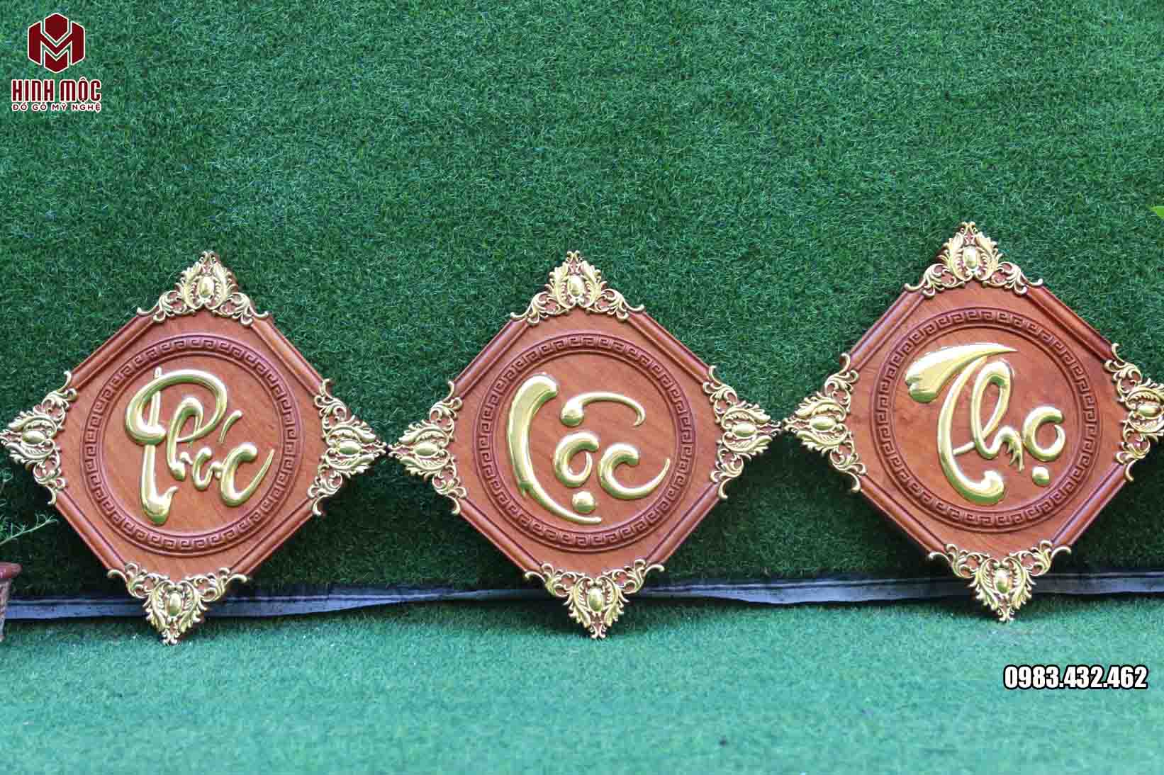Tranh gỗ Phúc Lộc Thọ rộng 40cm mỗi cạnh, dày 3cm. Sơn PU, mạ vàng cao cấp. Gỗ đẹp liền khối, đục nổi 1cm. Bộ PLT hương đỏ vuông 40cm giá 2,2 triệu, hương đá 40cm giá 3 triệu.