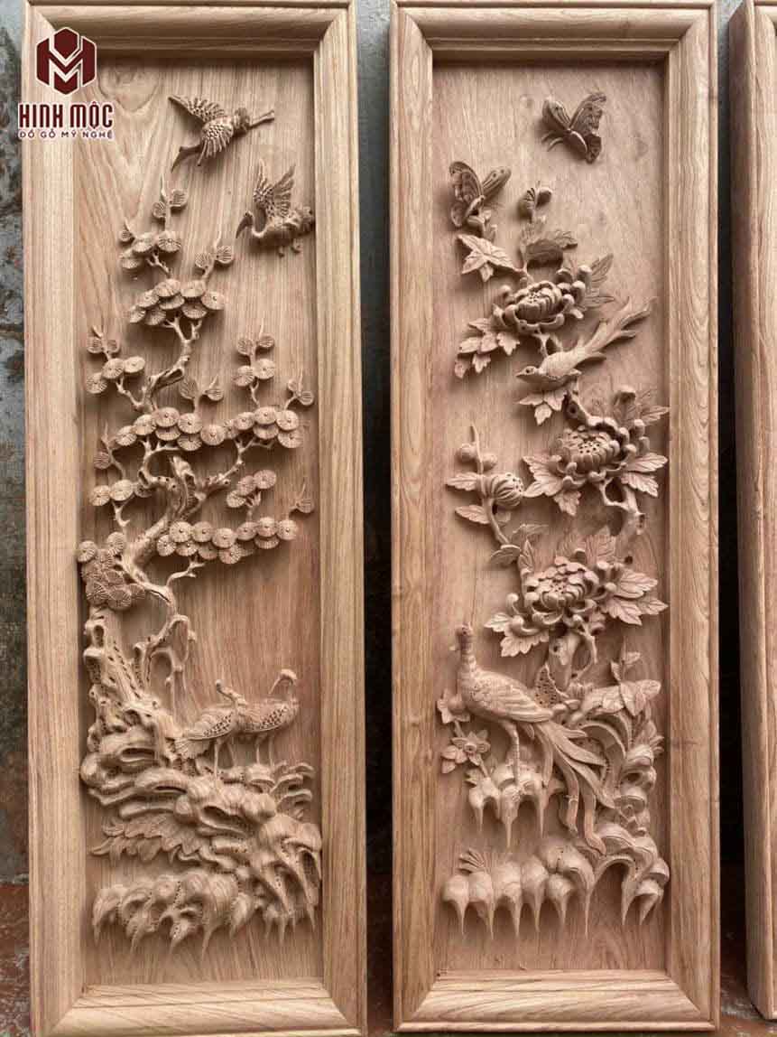 Tranh đục sâu đục kĩ, đục thô bằng máy CNC hiện đại. Móc lại bằng tay thủ công, đạt đến độ tinh xảo cao. Đường đục kênh bong sắc nét, chân thực. Bộ tranh cho ta hình ảnh của 4 mùa trong năm Xuân Hạ Thu Đông, mỗi mùa lại được biểu thị bởi 1 loài cây loài hoa đặc trưng.
