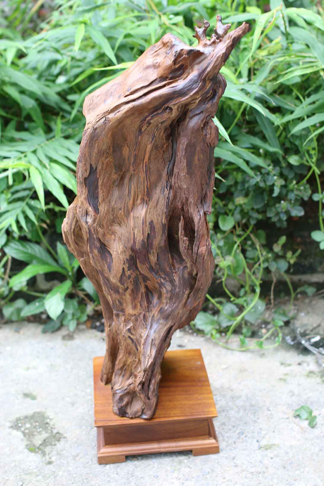 Tượng được đục tay trên khối gỗ lũa bách xanh Mộc Châu rất quý. Gỗ đẹp, thơm phức, dày dặn, mọng tinh dầu. Chất gỗ đẹp, kiểu dáng độc đáo, kì dị như chính con người của tổ Đạt Ma.
