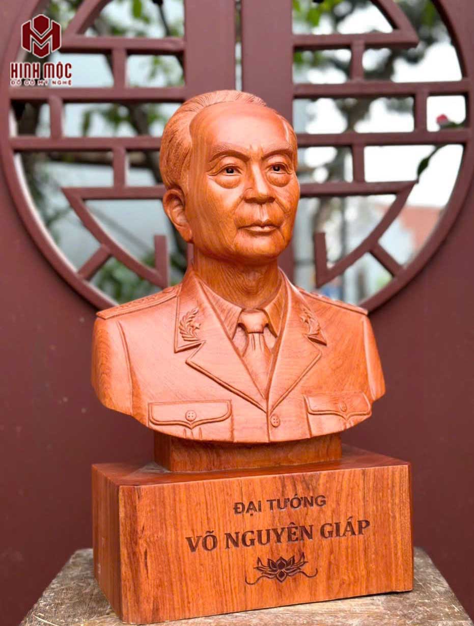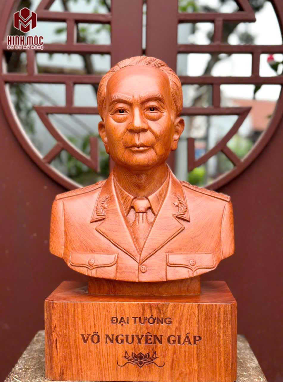 Tượng đục máy tinh xảo, gia công kĩ càng sạch sẽ. Nghệ nhân làm mặt thủ công thần thái, chân thực. Tạo hình chi tiết, sống động hình ảnh vị tướng nổi tiếng của dân tộc - đại tướng Võ Nguyên Giáp.