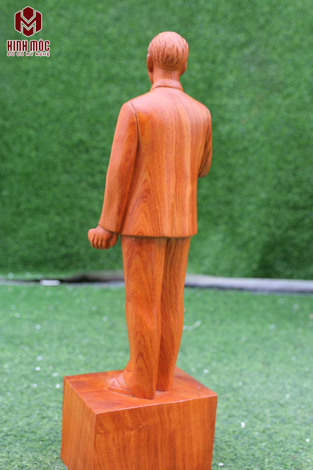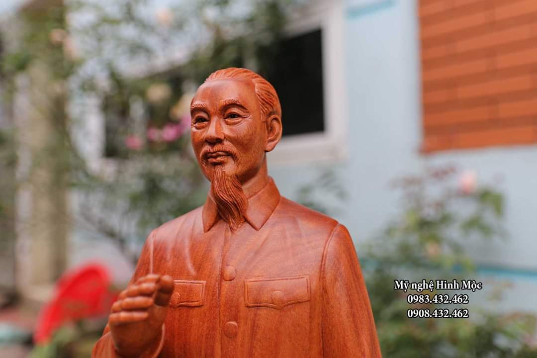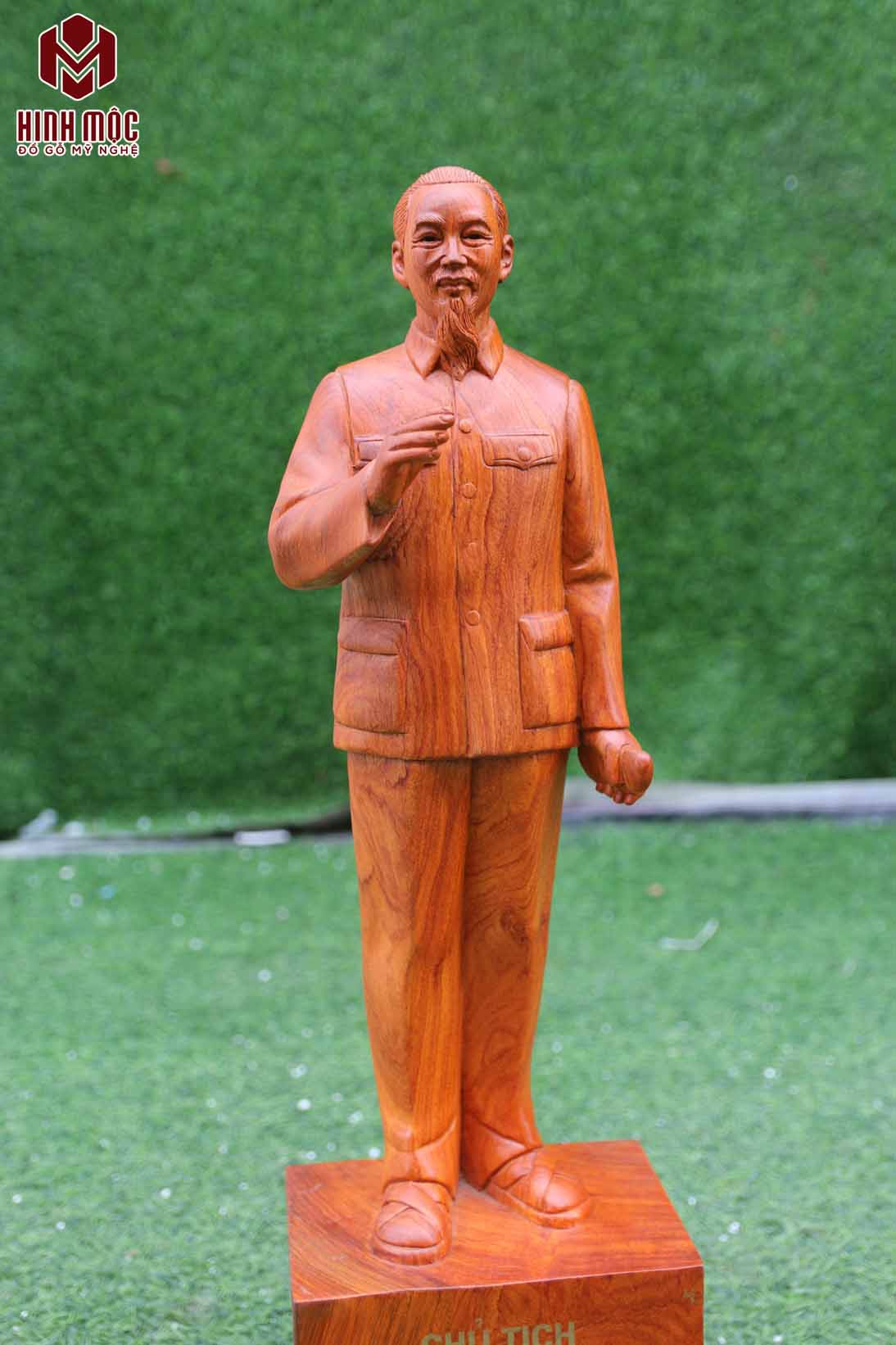Tượng toàn thân chủ tịch Hồ Chí Minh đục tay trên gỗ hương đỏ Nam Mỹ nhập khẩu. Gỗ đỏ, ít vân hơn gỗ hương đá. Bản đục tay hoàn toàn còn do nghệ nhân thực hiện nên nhìn khuôn mặt bác Hồ cũng chân thực hơn, sống động và hồn vía hơn so với bản đục máy CNC.