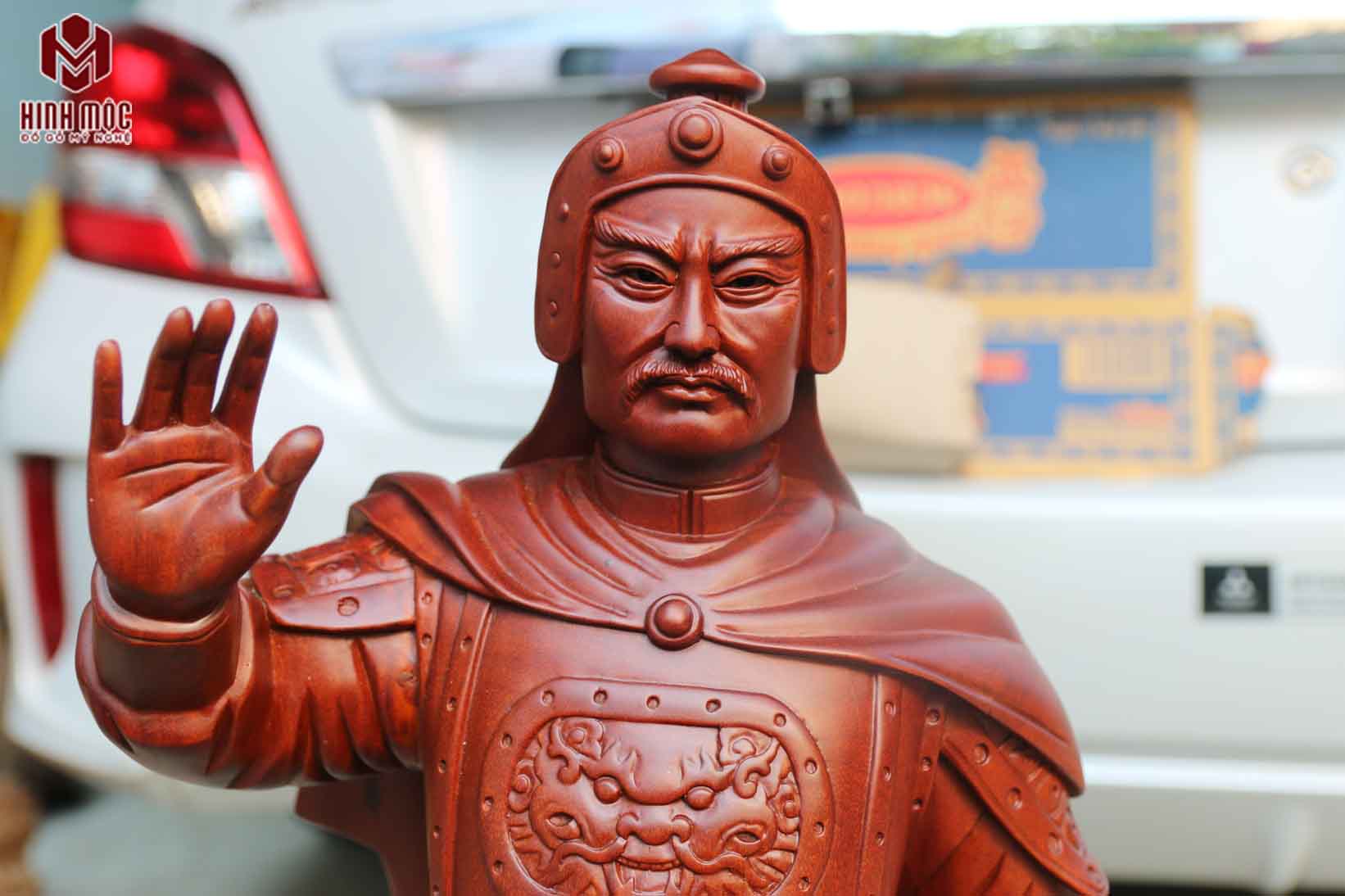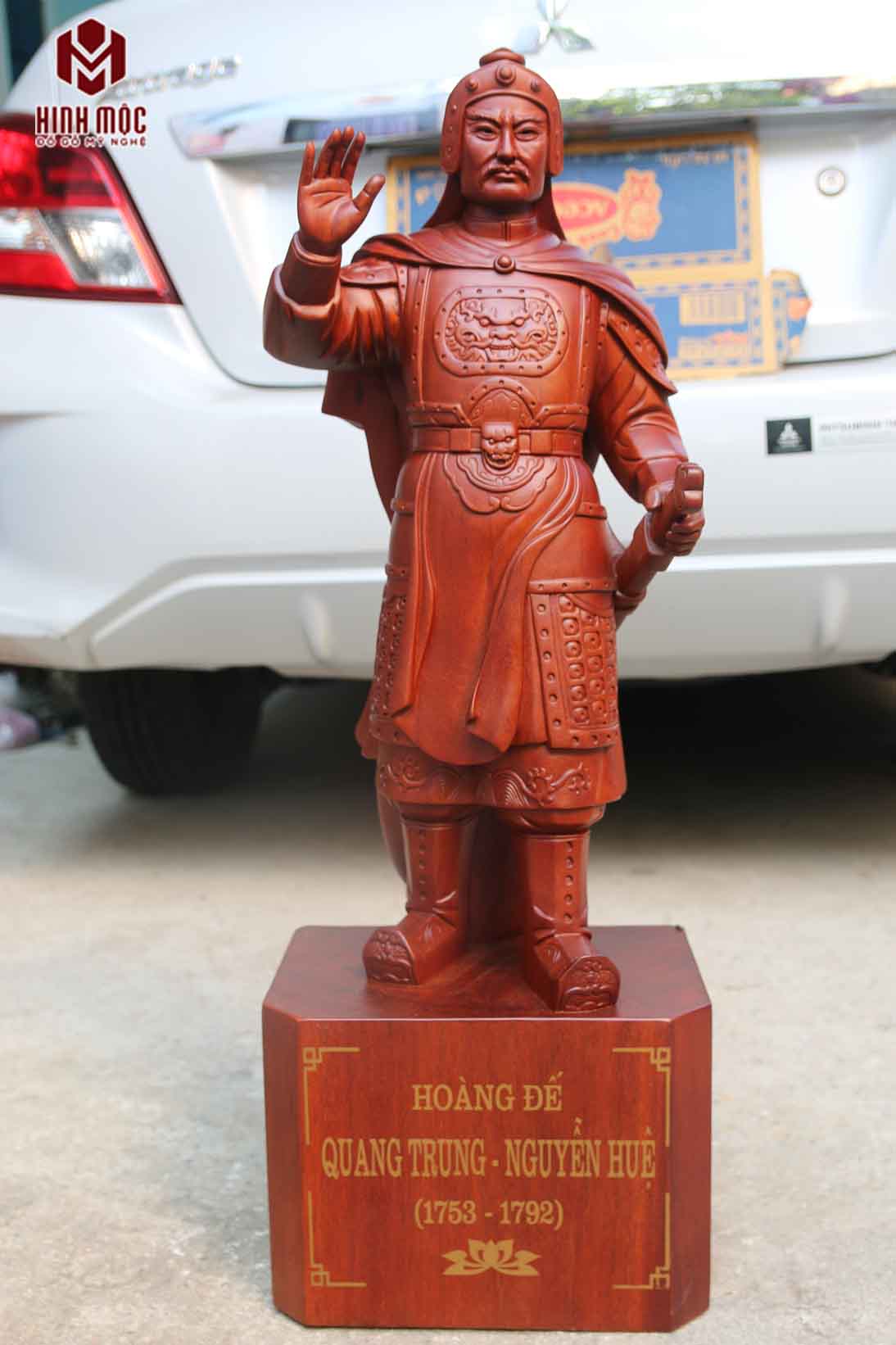 Bức tượng hoàng đế Quang Trung - Nguyễn Huệ được chúng tôi tạo hình dựa trên tượng đài ông tại gò Đống Đa lịch sử. Tượng đục trên gỗ hương nhập khẩu. Thiết kế, tạo hình bởi các kĩ sư đồ họa tài năng, phần làm mặt được tạo hình thủ công hoàn toàn bởi nghệ nhân tài hoa, kinh nghiệm. Nhờ đó, tác phẩm thực sự là thần thái và chân thực.