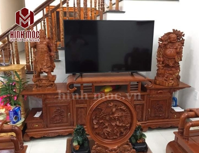 - Tượng gỗ Di Lặc dáng ngồi: kệ tivi, bàn trà, bàn uống nước,…là những khu vực phù hợp để bày mẫu tượng này. Bày tượng ở những vị trí này vừa tạo nên không gian ấm cúng, vừa giúp tượng phát huy được hết những giá trị phong thủy.