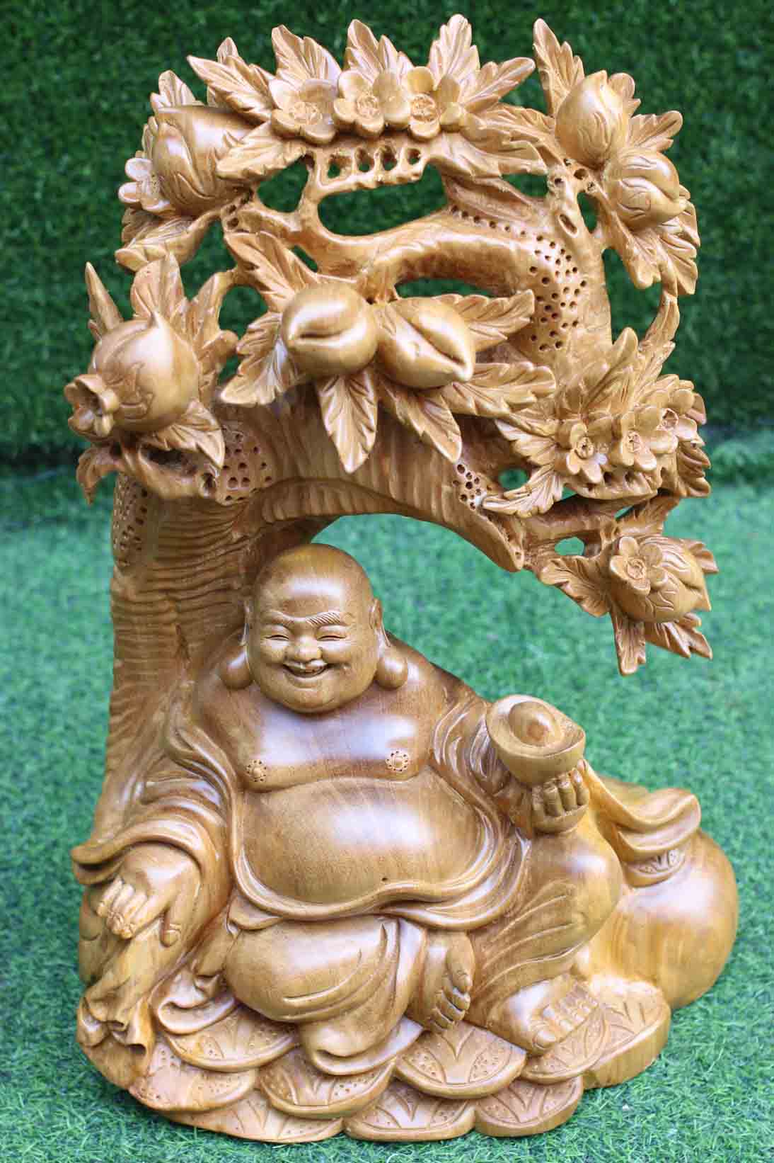 Tượng do nghệ nhân làng nghề mộc Đông Giao - Hải Dương đục tay hoàn toàn. Đục sắc nét, chân thực, tỉ mỉ thần thái. Chất liệu là gỗ xá xị (gù hương), đây là gỗ xá xị vàng Quảng Trị, gỗ gốc liền khối, thơm nức tinh dầu. Hình ảnh trung tâm của tác phẩm là Phật Di lặc ngồi lưng dựa cội đào cổ thụ, bên dưới gốc là tiền vàng chồng lớp, có cả 1 hũ đựng tiền vàng lớn đặt bên cạnh. Phía trên là cành đào với hoa lá trĩu cành.