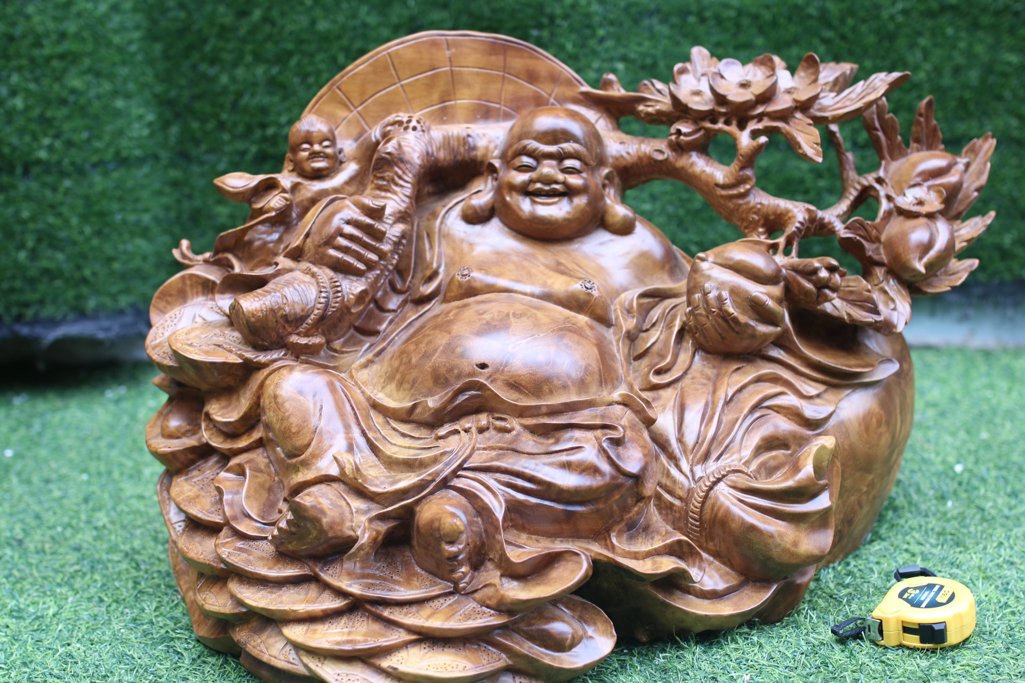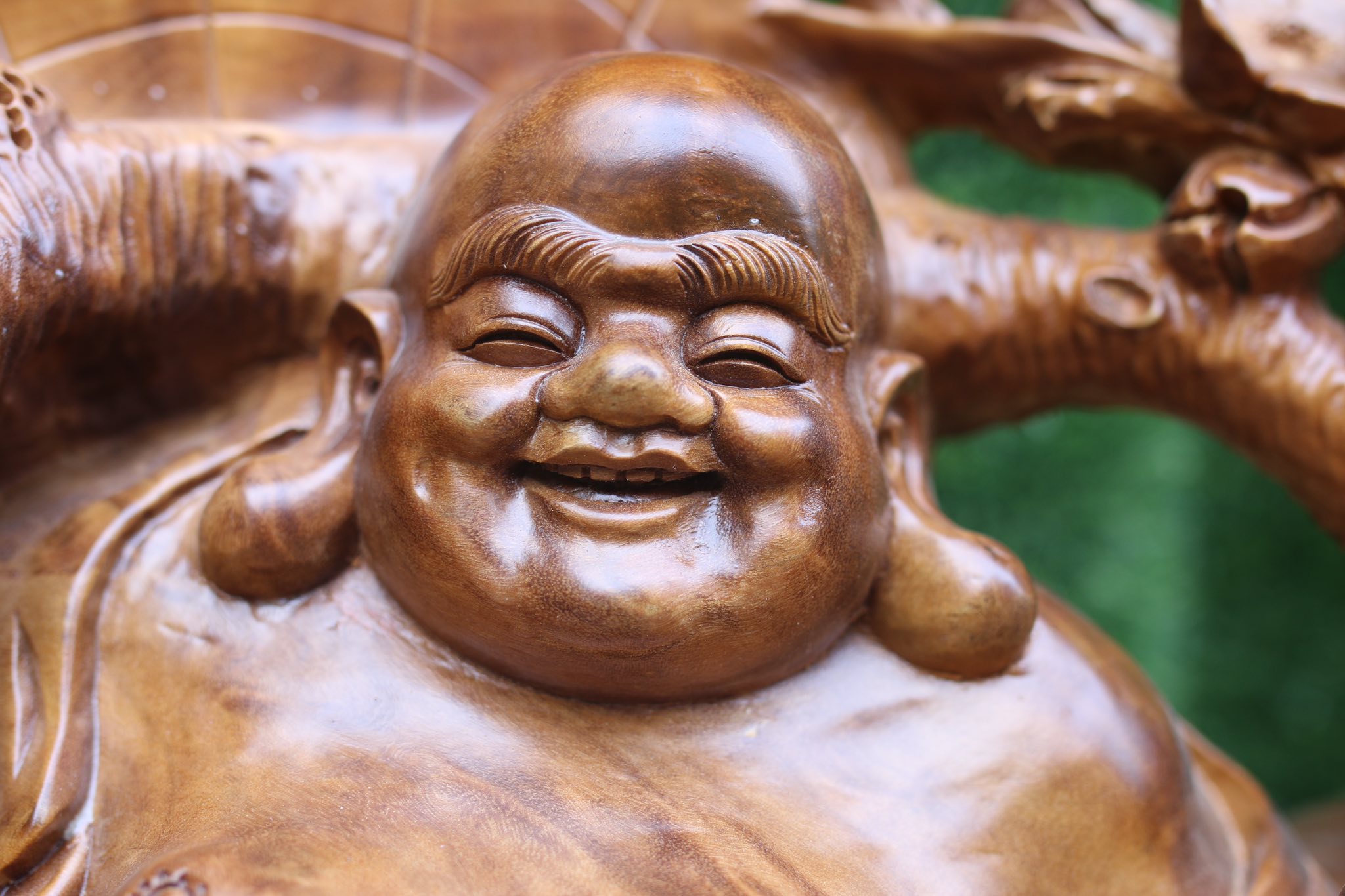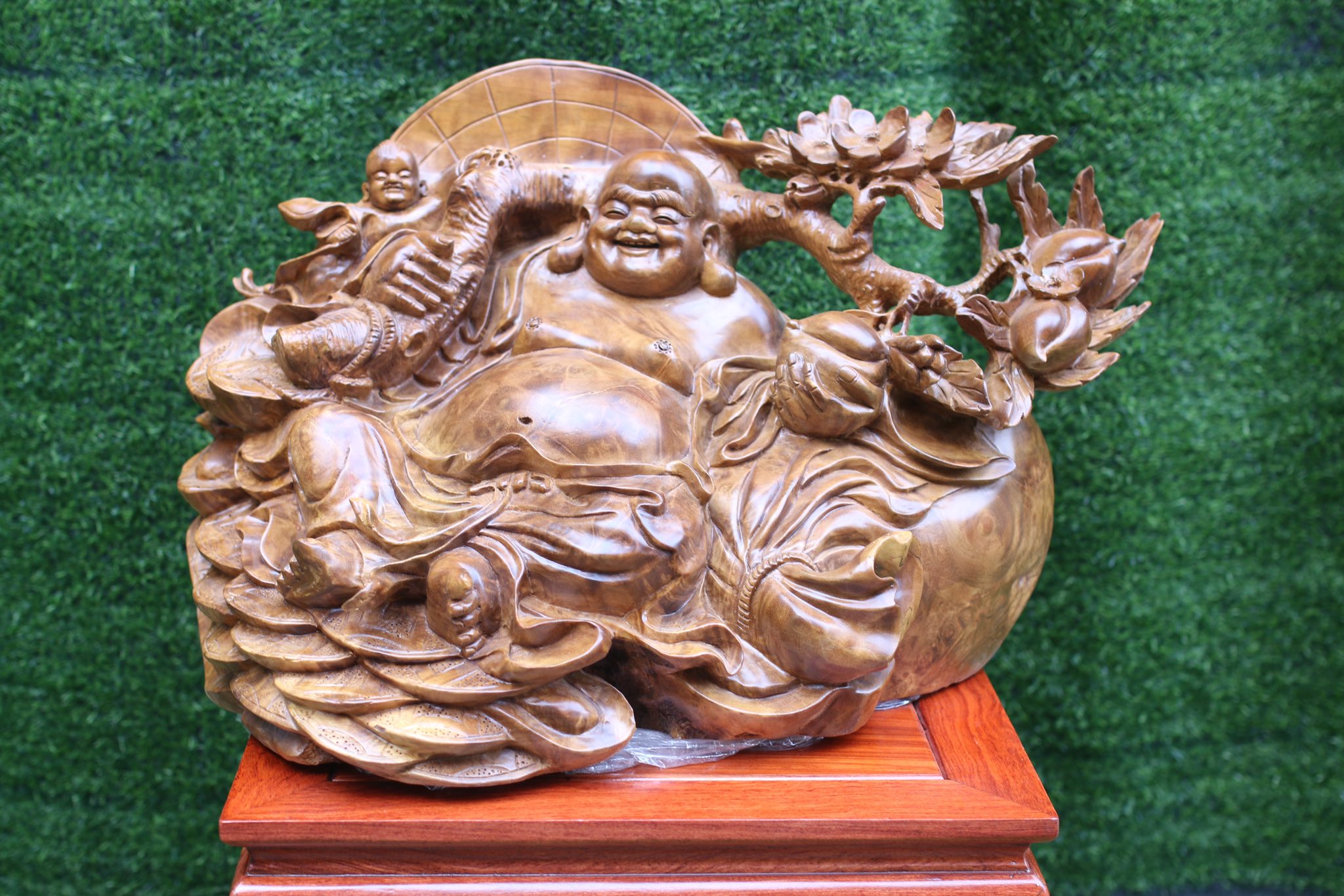 Tượng Di Lặc ngồi gốc đào gỗ nu xá xị - Pho tượng đẹp có 1 không 2