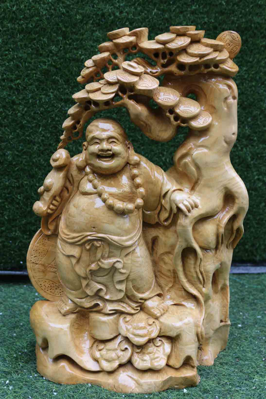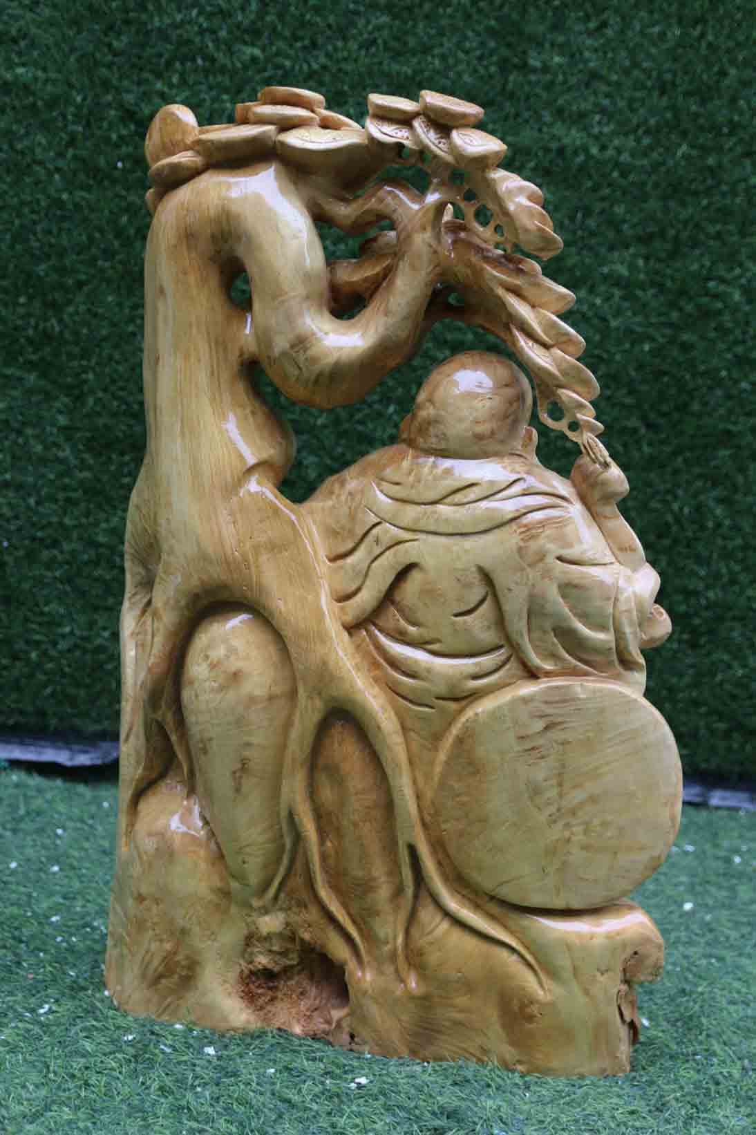 Tượng Di Lặc đứng cây tiền tài lộc gỗ nu kháo - Tài lộc dâng tràn