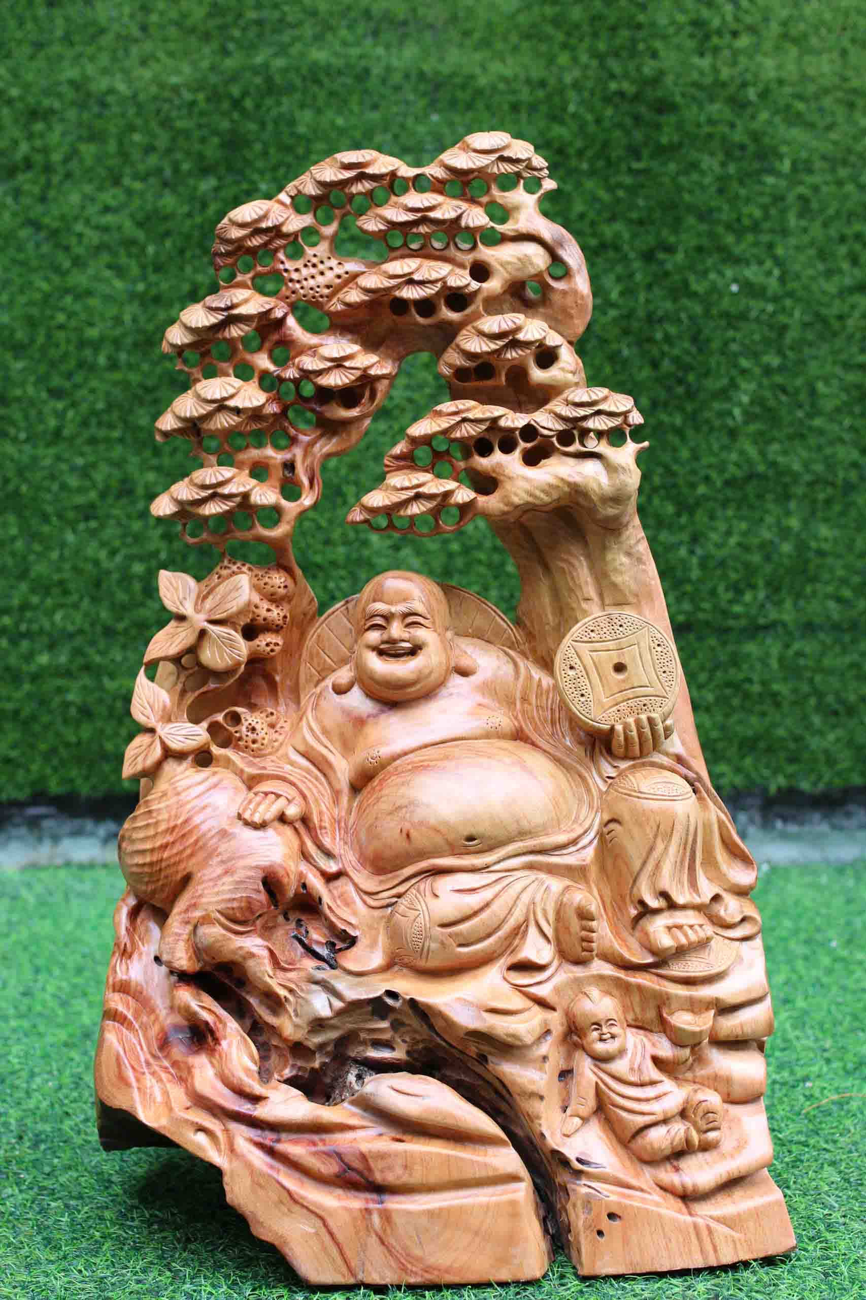 Tượng Di Lặc ôm bao tiền cây tùng cao 60cm gỗ xá xị