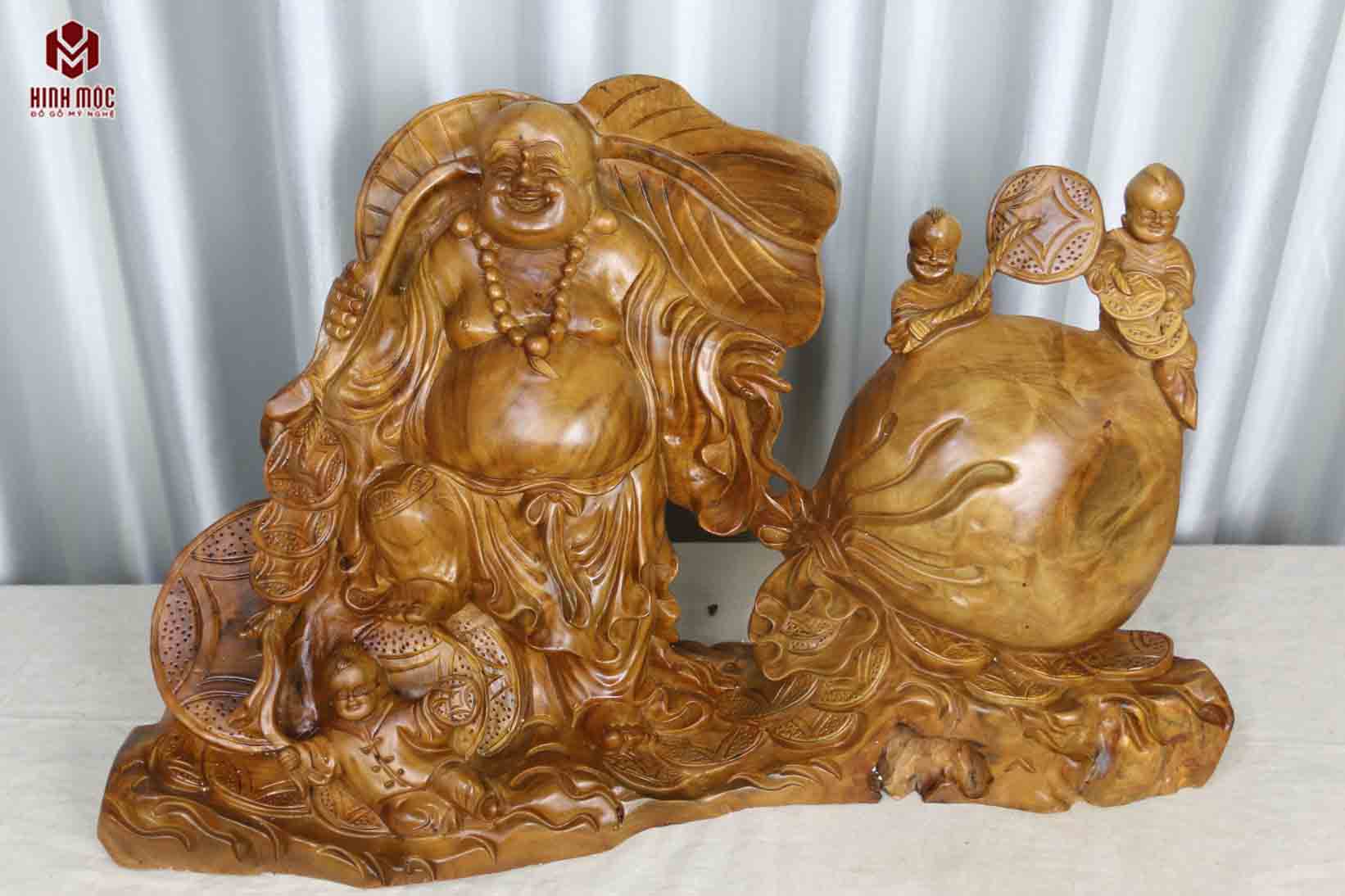 Đây là bức tượng mang ý nghĩa tài lộc dồi dào. Tượng mô tả lại hình ảnh Phật Di Lặc kéo theo bao tiền vàng trĩu nặng, vây quanh là 3 cháu nhỏ vui vẻ, tươi cười. Người ta cho rằng đó là hình ảnh tốt lành, gia chủ trưng bức tượng thì sẽ được may mắn, tài lộc giống như là được Phật Di Lặc mang của đến trao tặng.