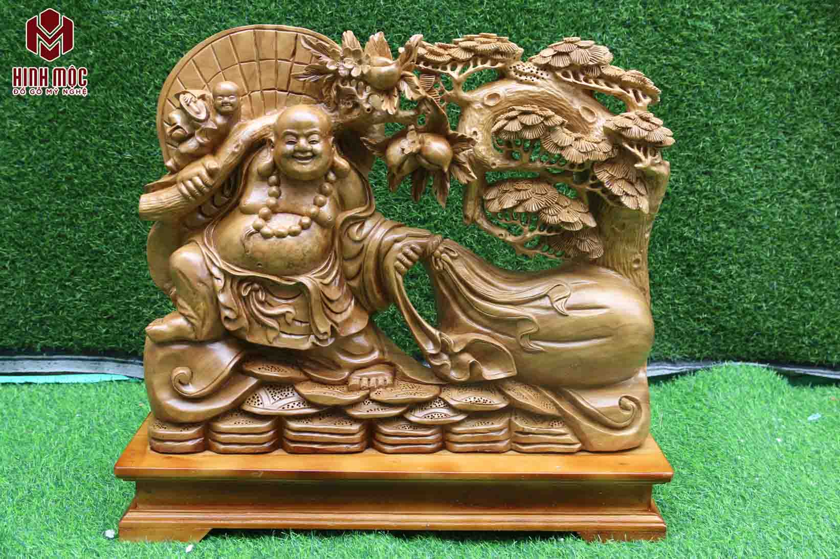 Tác phẩm thực sự xuất sắc mà lại có giá bán rất phải chăng - 5 triệu đồng bao ship. Tượng được đục tay bởi nghệ nhân nhiều kinh nghiệm. Tác phẩm mô tả lại hình ảnh ông Phỗng (1 cách gọi khác của Phật Di Lặc) đang hoan hỉ kéo theo bao tiền vàng, vai vác theo cành đào tiên, bên cạnh là cây tùng quân tử sum suê rậm rạp.