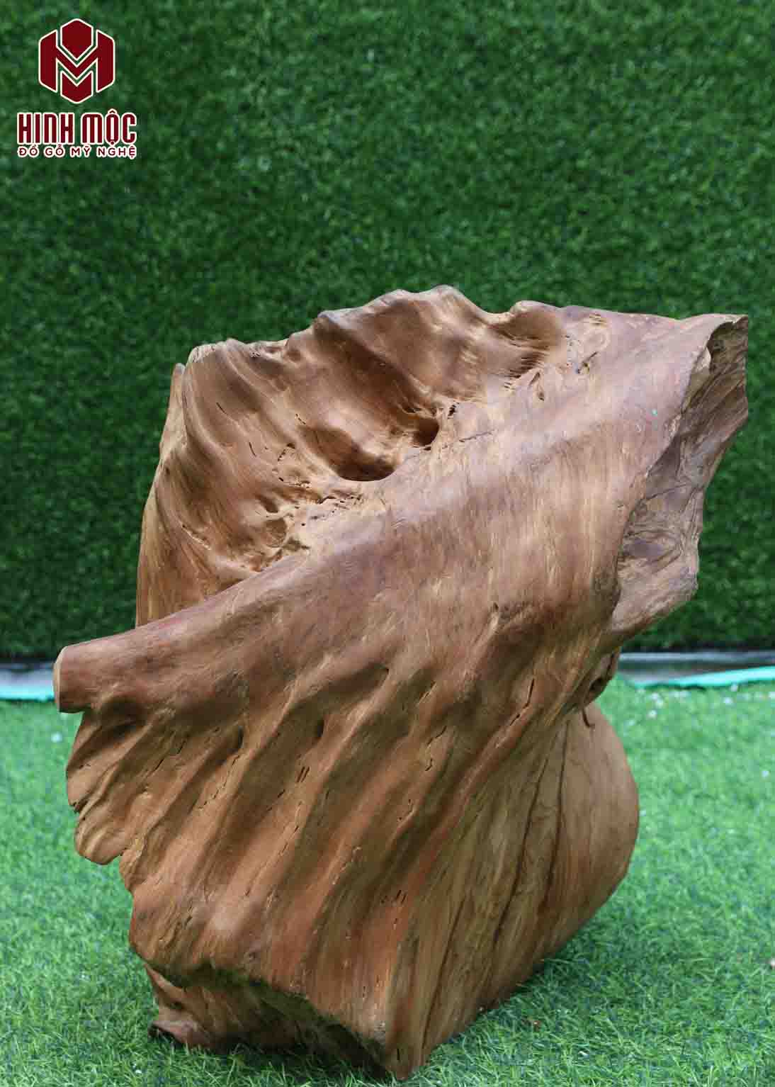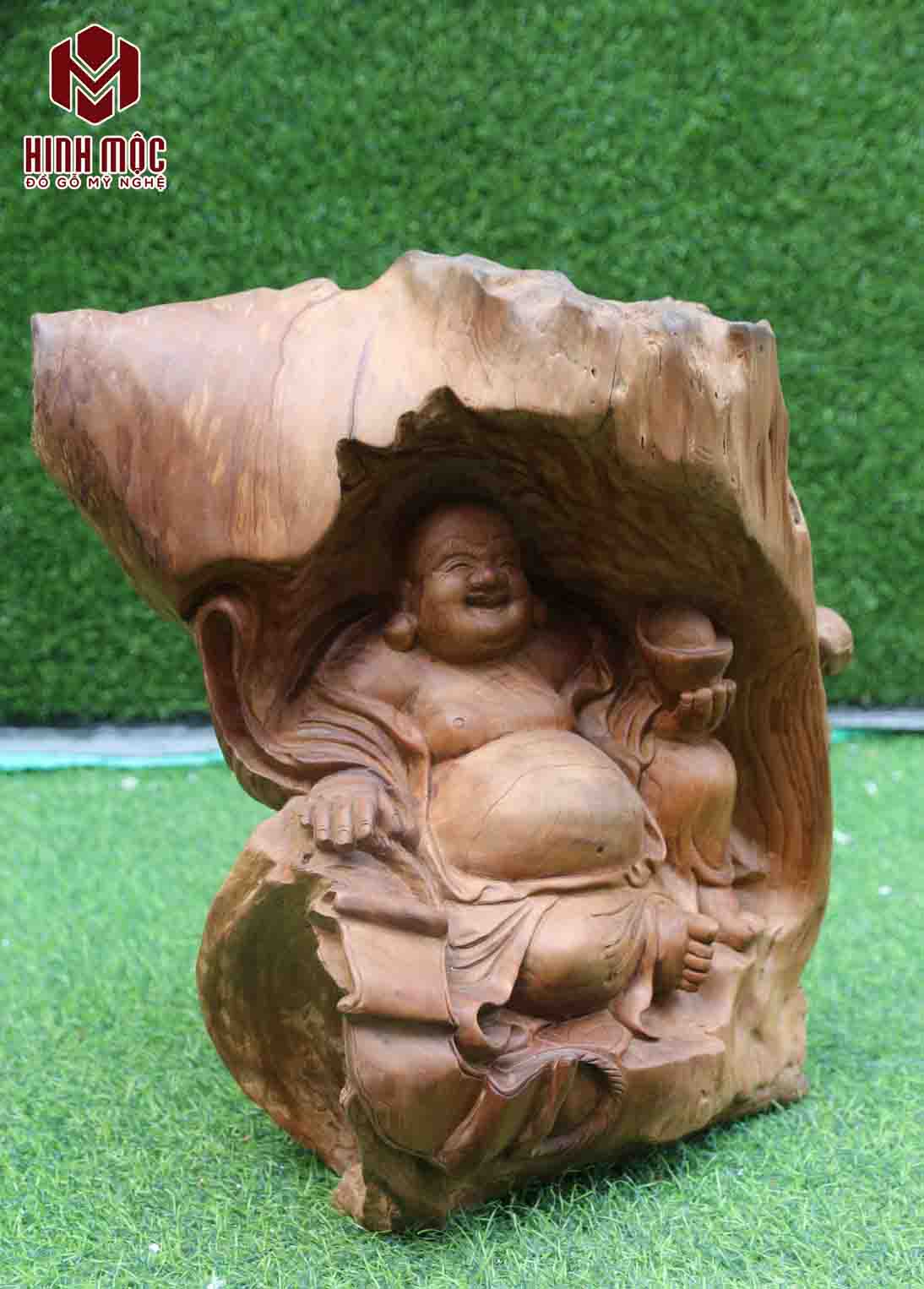 Bức tượng Di Lặc ở trên được đục trên gỗ Ngọc Am Hà Giang. Gỗ gốc, măng dày dặn, mọng tinh dầu, rất thơm. Trên cơ sở phần gỗ quý đó, chúng tôi biến nó thành hình ảnh Phật Di lặc ngồi trong hang đá, tay nâng thỏi vàng, tươi cười hoan hỉ như là đang mong muốn đem tặng tài lộc tới gia chủ.