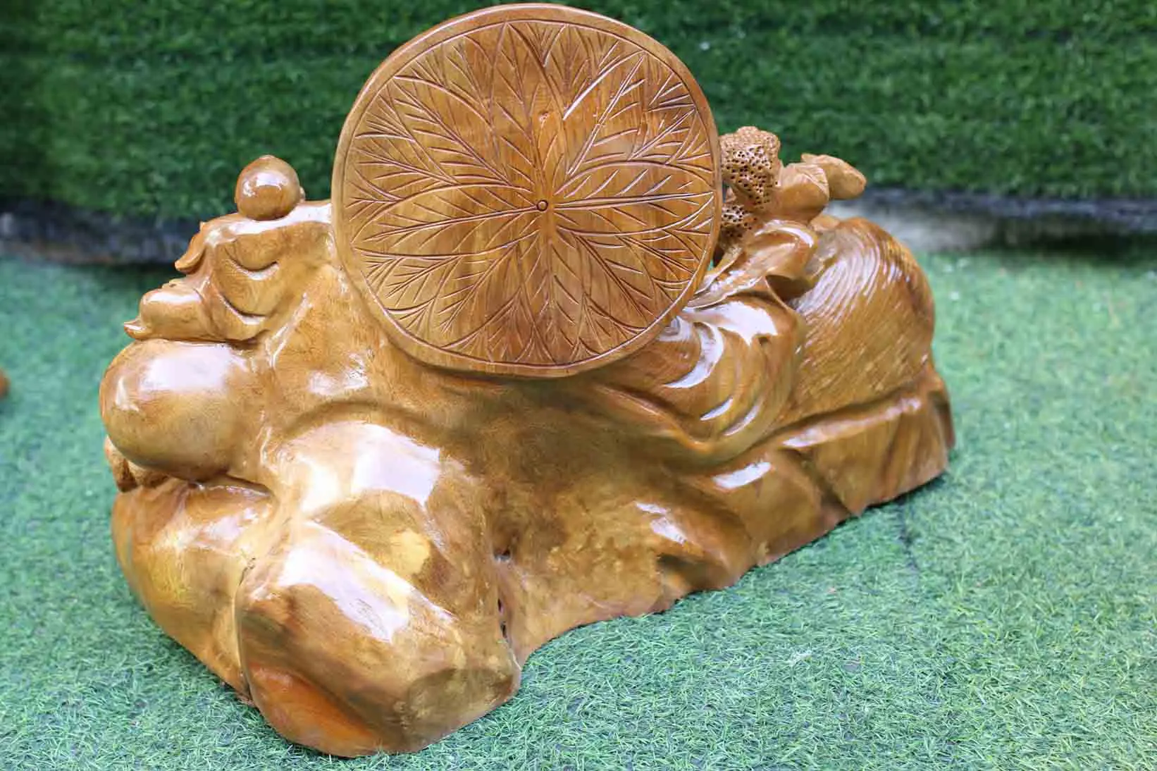 Tượng đục tay nghệ nhân. Gỗ xá xị liền khối. Xá xị xanh Quảng Trị thơm nức. Đẹp không lỗi lầm. Tượng cao 45cm, ngang 68cm, sâu 30cm. Phù hợp đặt tại đôn kẹp kê đầu bàn nơi phòng khách, góc kệ TV, văn phòng làm việc...
