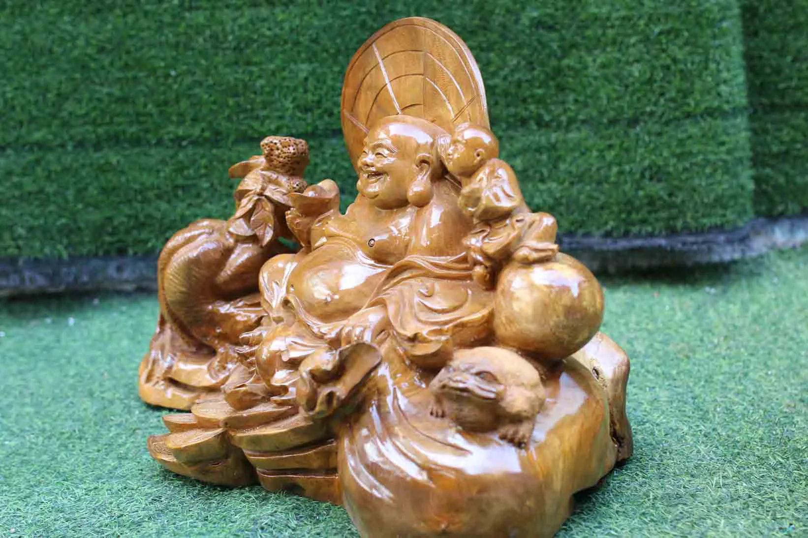 Bức tượng bề thế, lợi về chiều ngang, kiểu dáng chắc chắn, vững bền. Gợi đến sự ổn định và lâu dài. Tác phẩm còn được đục tay hoàn toàn, gỗ gốc nặng, nhiều tinh dầu, liền khối. Luôn luôn tỏa ra mùi tinh dầu xá xị (gù hương) rất dễ chịu. Nội dung bức tượng là hình ảnh ông Phật Di Lặc ngồi hoan hỉ trên đống tiền vàng, tay cầm theo bao tiền lớn, bên cạnh là củ sâm ngàn năm và cụ cóc phong thủy tài lộc. Có 1 chú tiểu nhỏ bên cạnh Phật Di Lặc khiến người ta liên tưởng đến sự tài lộc lâu bền, nối tiếp, kế thừa...