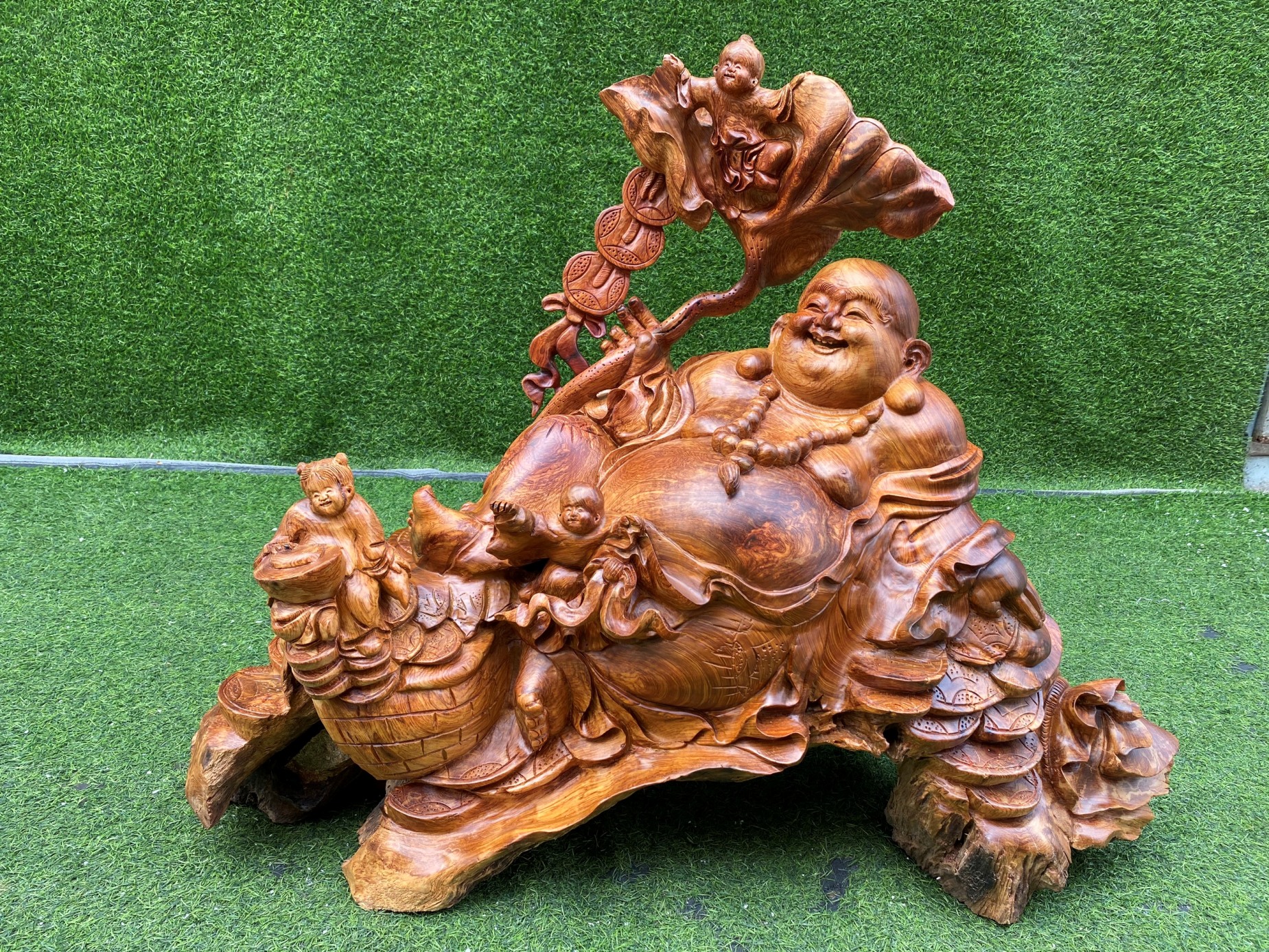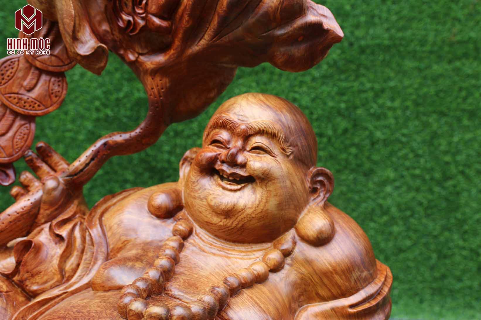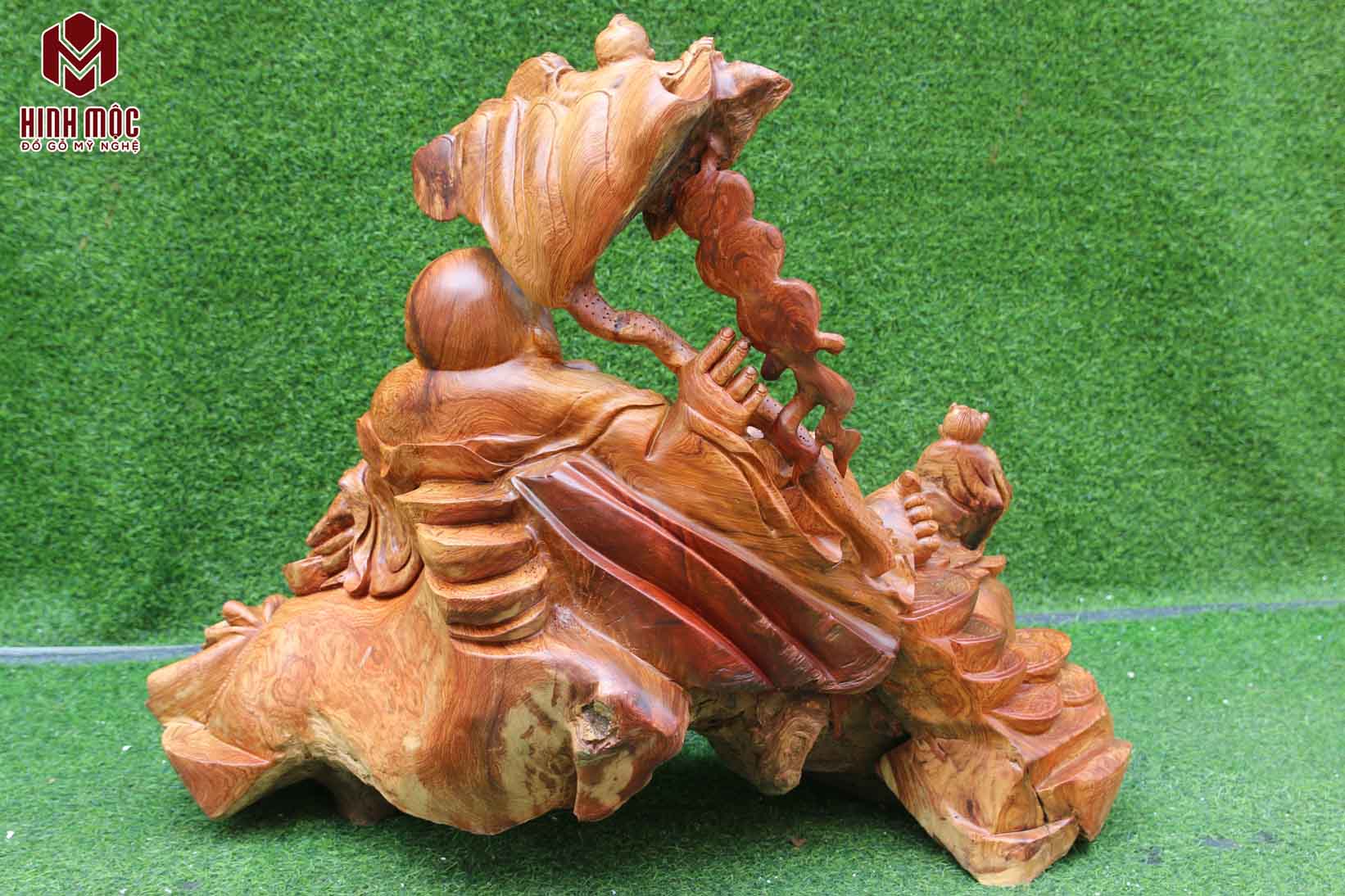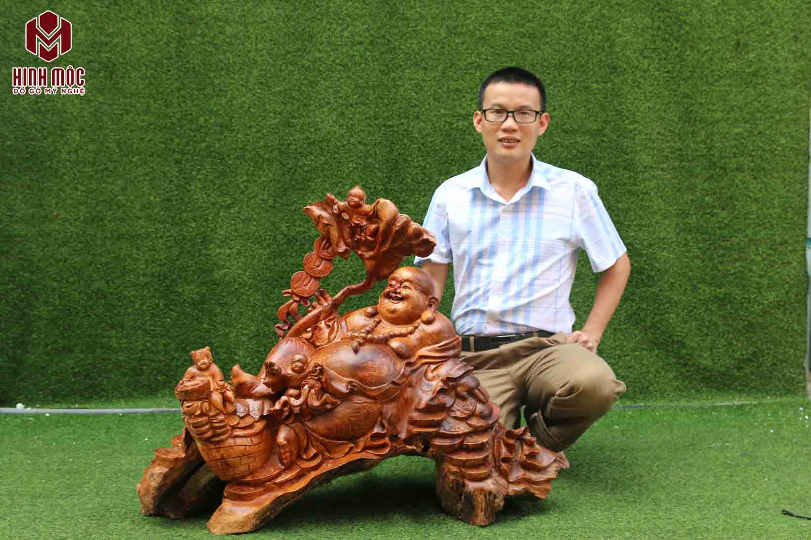 Di Lặc tam phúc cầm lá sen cao 74cm, chiều ngang phần dài nhất là 90cm, chiều sâu 40cm nặng chừng 40kg. Gỗ hương ta liền khối hoàn toàn. Đẹp hoàn hảo, cam kết không nứt, không mối mọt, co ngót...