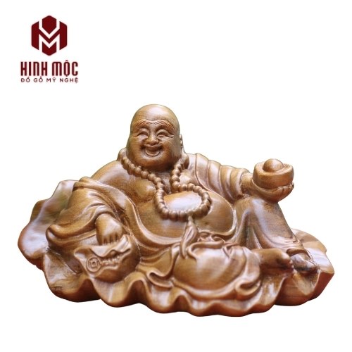 Tác phẩm này mô tả lại hình ảnh Phật Di Lặc ngồi thảnh thơi trên tấm lá sen, miệng cười tươi, mắt cười híp mí, tay nâng 1 thỏi vàng lớn. Tác phẩm là sản phẩm từ máy đục CNC hiện đại, các chi tiết được tạo hình trung thực và cân đối. Sau đục, thợ thủ công tiến hành sửa tay bằng giấy ráp giúp tượng mịn màng, sạch sẽ.