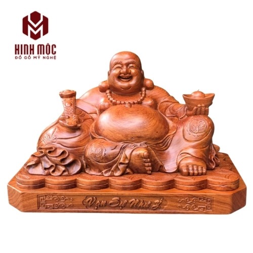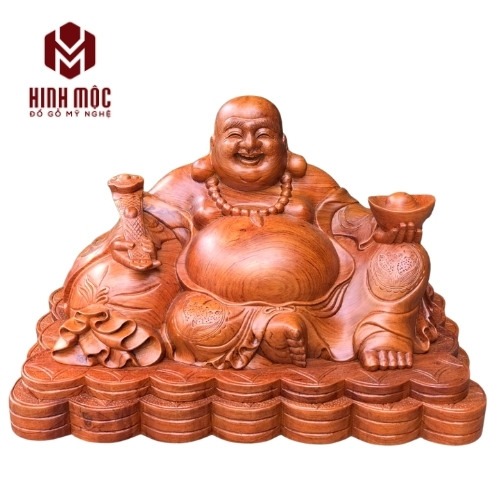 Mẫu ở trên là loại phổ biến và được ưa chuộng nhất với kích thước cao 30cm chiều ngang 50cm và chiều sâu là 28cm. Tượng được đục máy CNC, sửa tay kĩ sau đục. Tác phẩm là ghép giữa thân Phật Di Lặc với phần đế tiền phía dưới.
