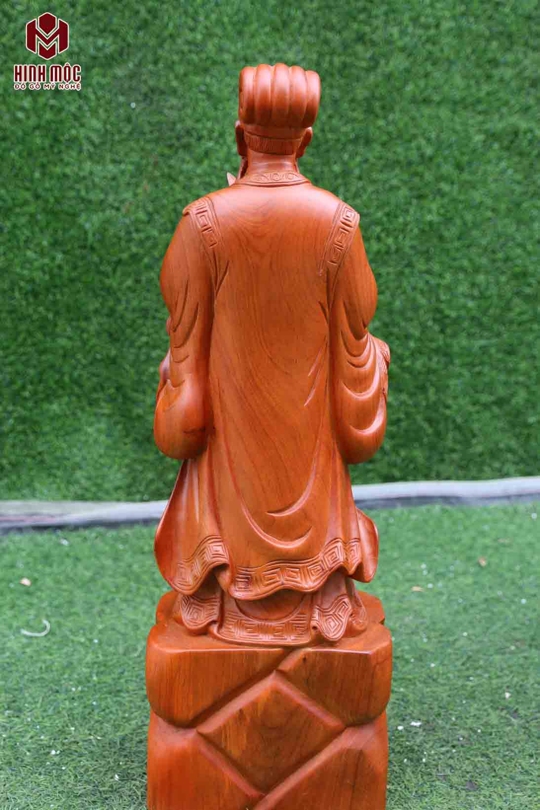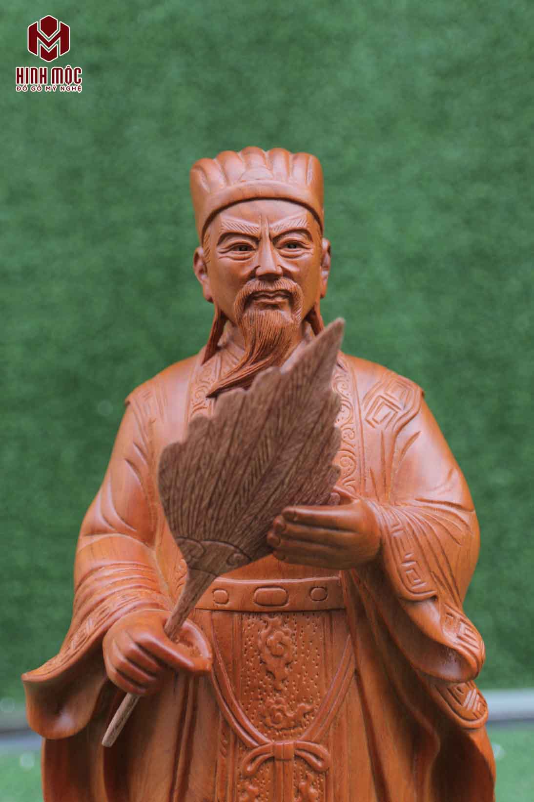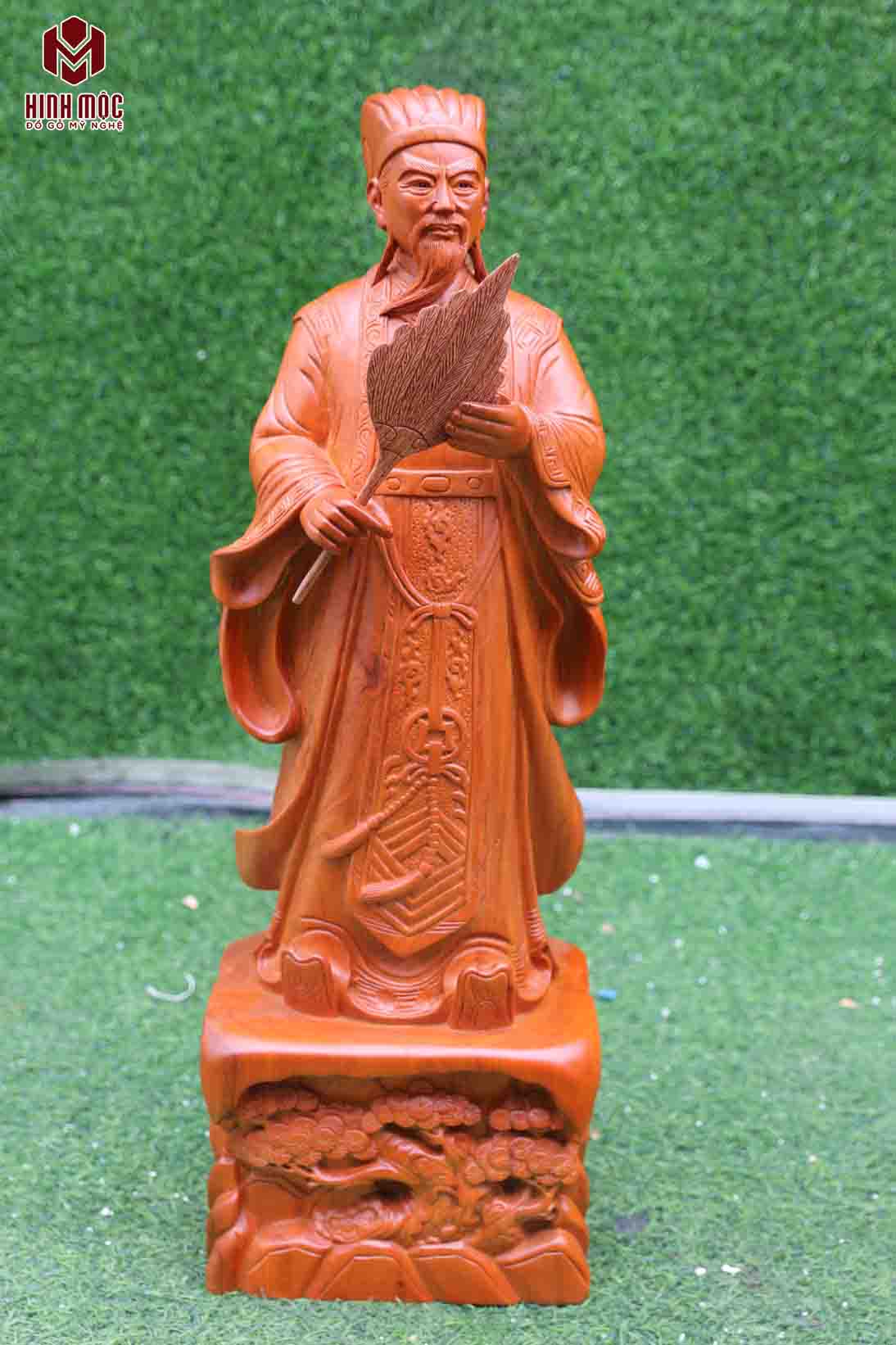 Tượng đục máy CNC, làm mặt thủ công. Tạo hình hình ảnh Gia Cát Lượng Khổng Minh đang đứng trên bục, thân bục chạm cây tùng. Tượng có chiều cao 60cm, chiều ngang 15, chiều sâu 13cm, gỗ hương đá nhập khẩu tuyển chọn.