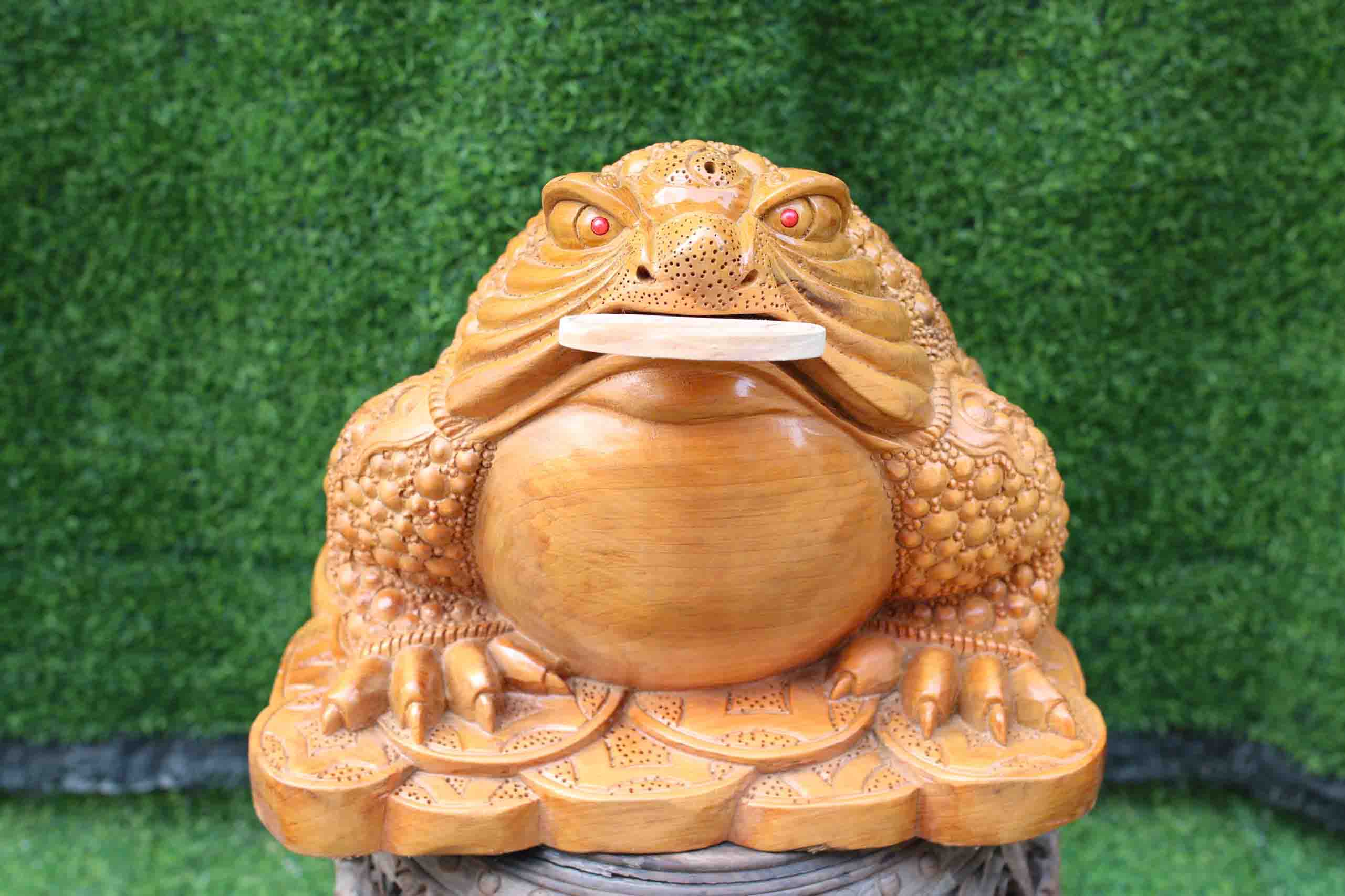 Đặc điểm nổi trội ở cụ cóc này là kích thước ngang 40cm cao 30cm. Nhờ phôi gỗ dày đẹp nên cụ cóc nhìn rất cân đối và bề thế. Chiều ngang 40cm chiều sâu 35 chiều cao 30cm nặng chừng 15kg. Đục nghệ, mặt dữ, màu vàng tươi tự nhiên nên rất phù hợp để trưng bày trong nhiều không gian khác nhau ở nhà bạn!