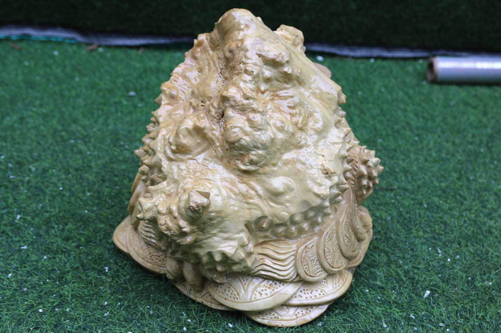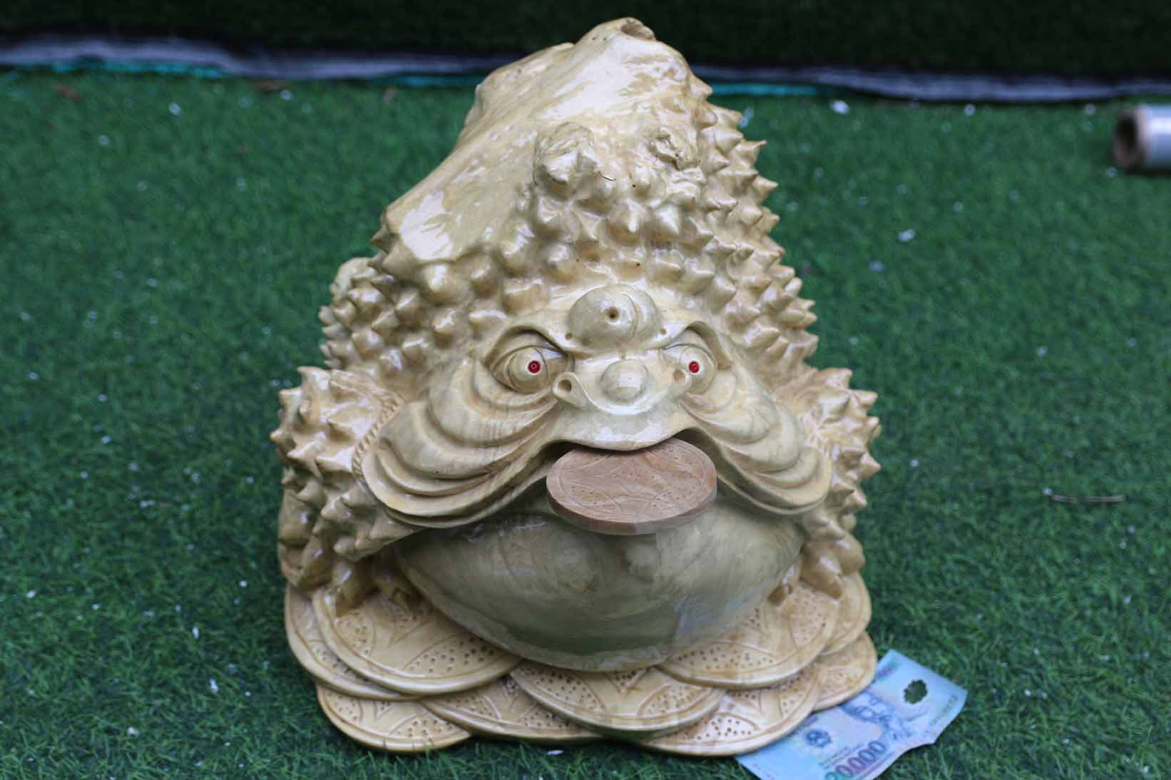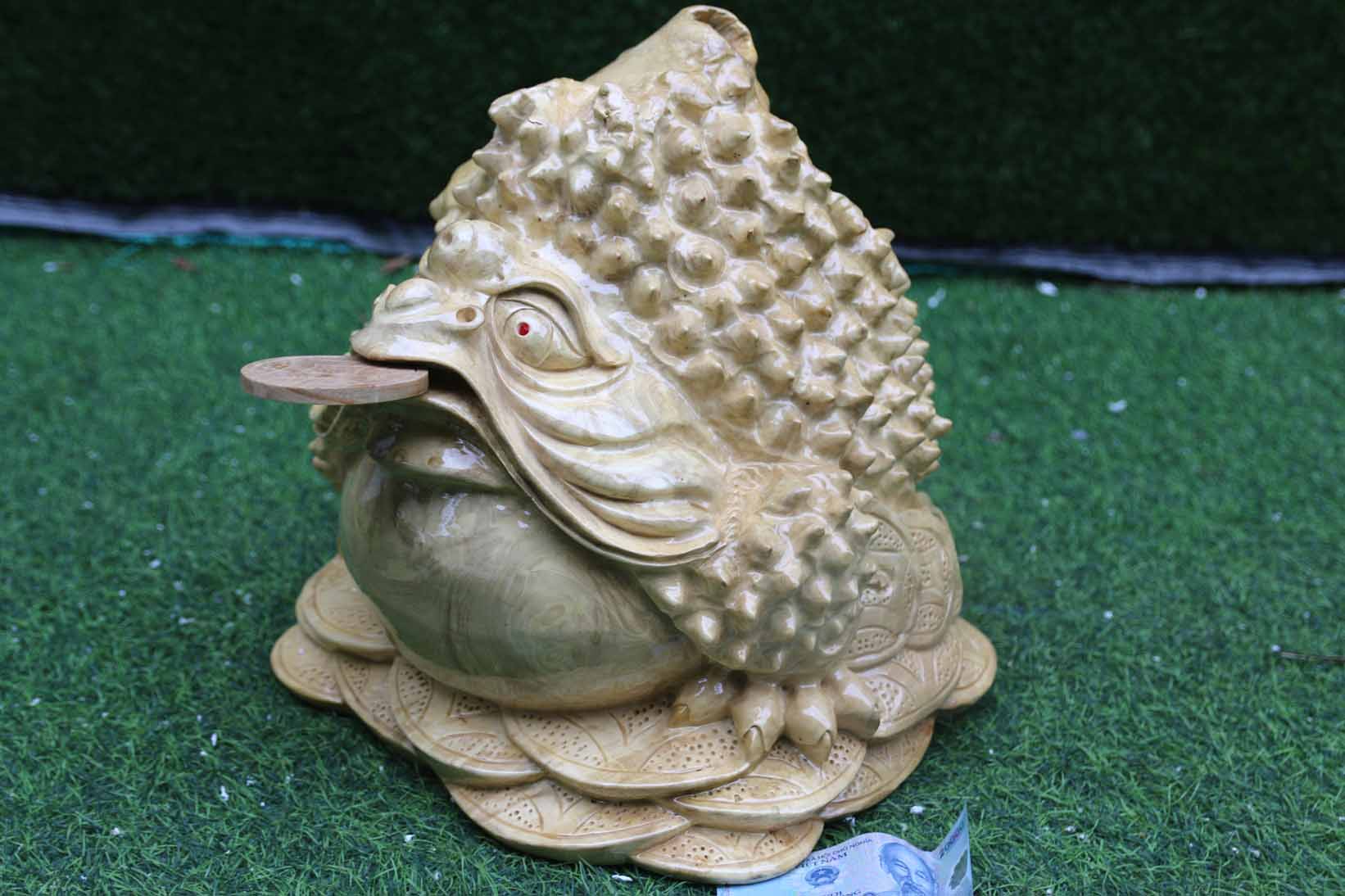 Xuất phát từ đó, chúng tôi tạo hình cụ cóc nghiến ngang 40cm kiểu dáng rất dị ở dưới đây. Cụ được đục dựa trên hình thế tự nhiên của 1 cục gốc gỗ nghiến già cổ. Phần nu độc đáo nhô cao. Trên đó còn có nhiều vết nu rục, các lỗ sâu mục tự nhiên nay đã nu gần như hóa thạch. Thông thường, người ta hay tạo hình cụ cóc ngồi hoặc nằm rạp trên đống tiền vàng, thì cụ cóc này mang 1 biến thể mới với phần lưng nhô cao. Trên lưng là các vết nu rục, hang hốc tự nhiên rất độc đáo.