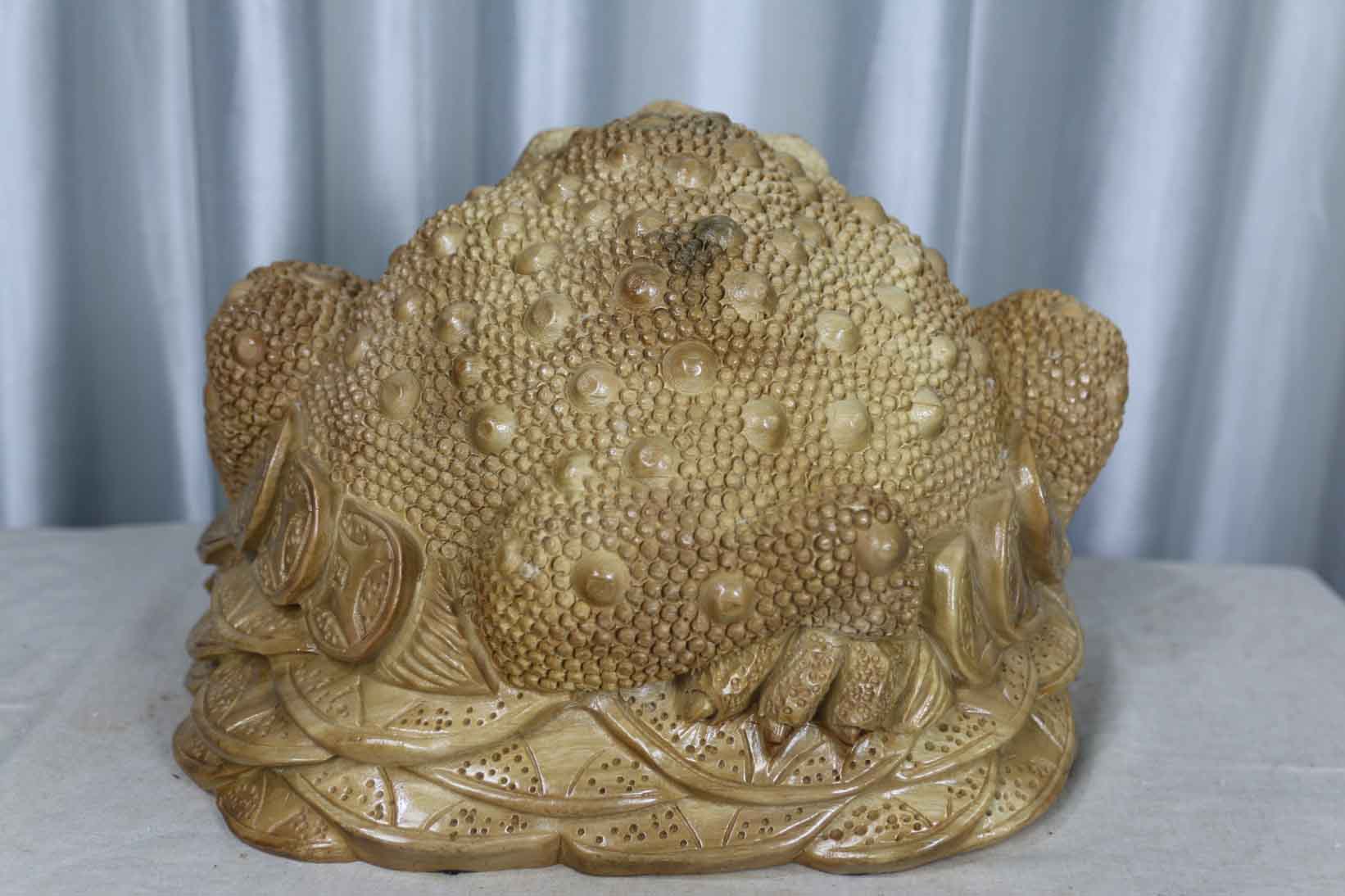 Điều ít người chú ý ở các mẫu cóc ngậm tiền đó là cụ cóc bao giờ cũng chỉ có 3 chân. Cụ cóc gỗ xá xị này cũng vậy, cụ có 3 chân bởi cụ là cóc phong thủy tài lộc chứ không phải con cóc bình thường.