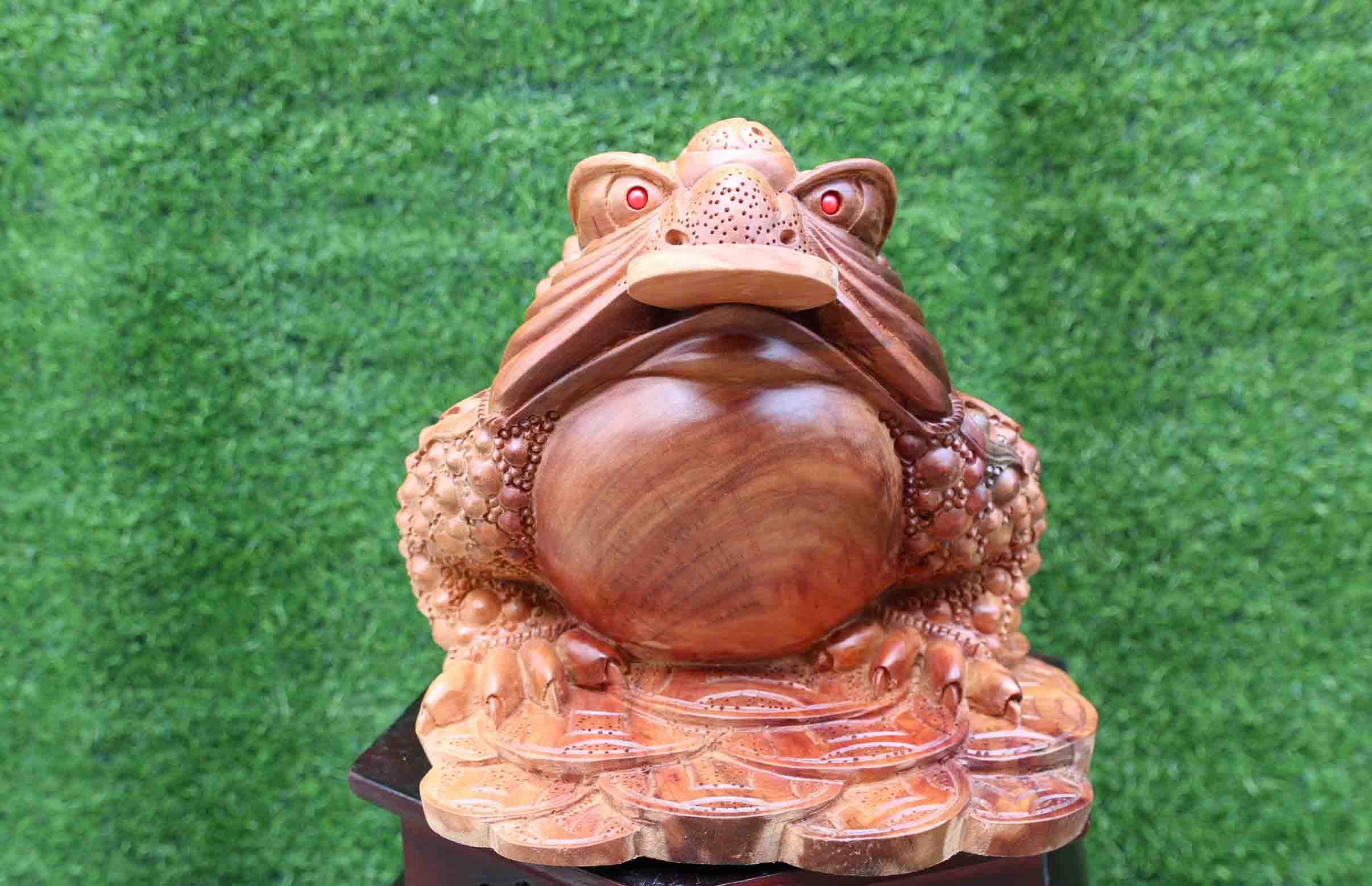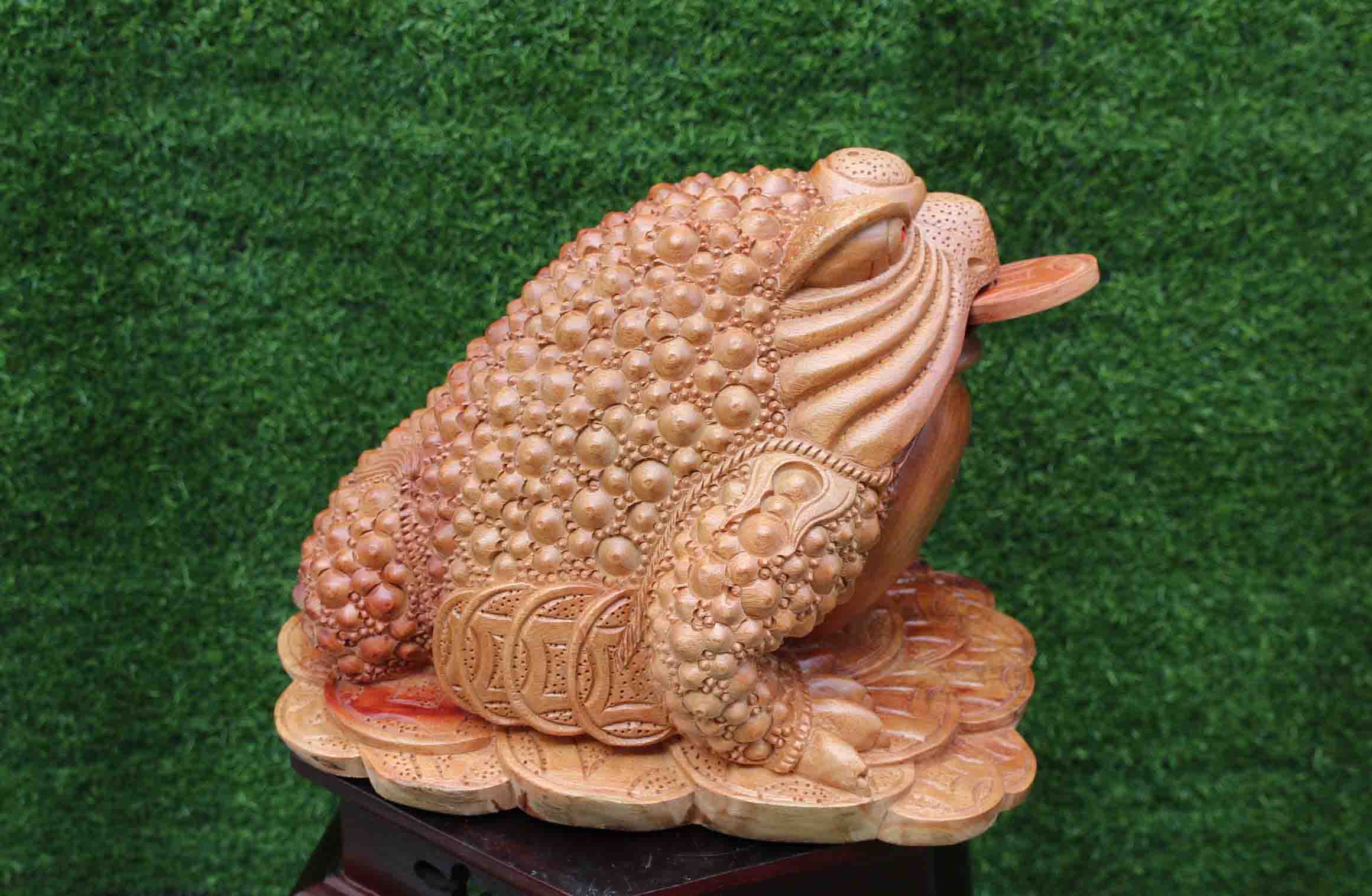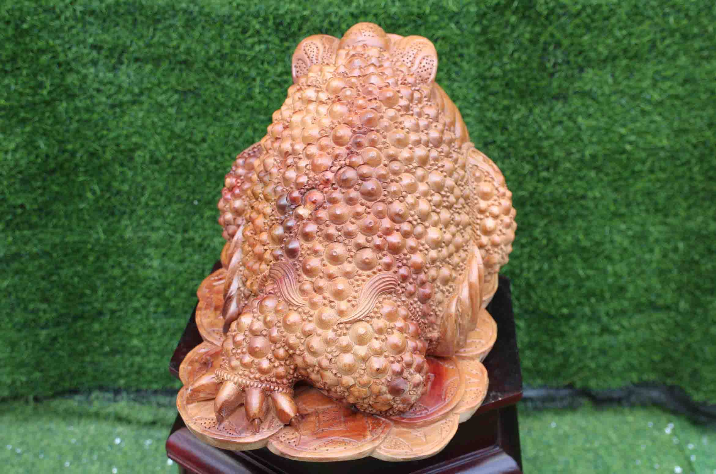 Cóc gỗ gù hương ngang 35cm ở trên được đục tay hoàn toàn. Đục trên gỗ xá xị đỏ Tây Nguyên. Tượng mô tả lại hình ảnh cụ cóc ngồi chiễm chệ trên đống tiền vàng, miệng ngậm đồng vàng lớn. Đây là biểu hiện của tài lộc, thịnh vượng về nhà.
