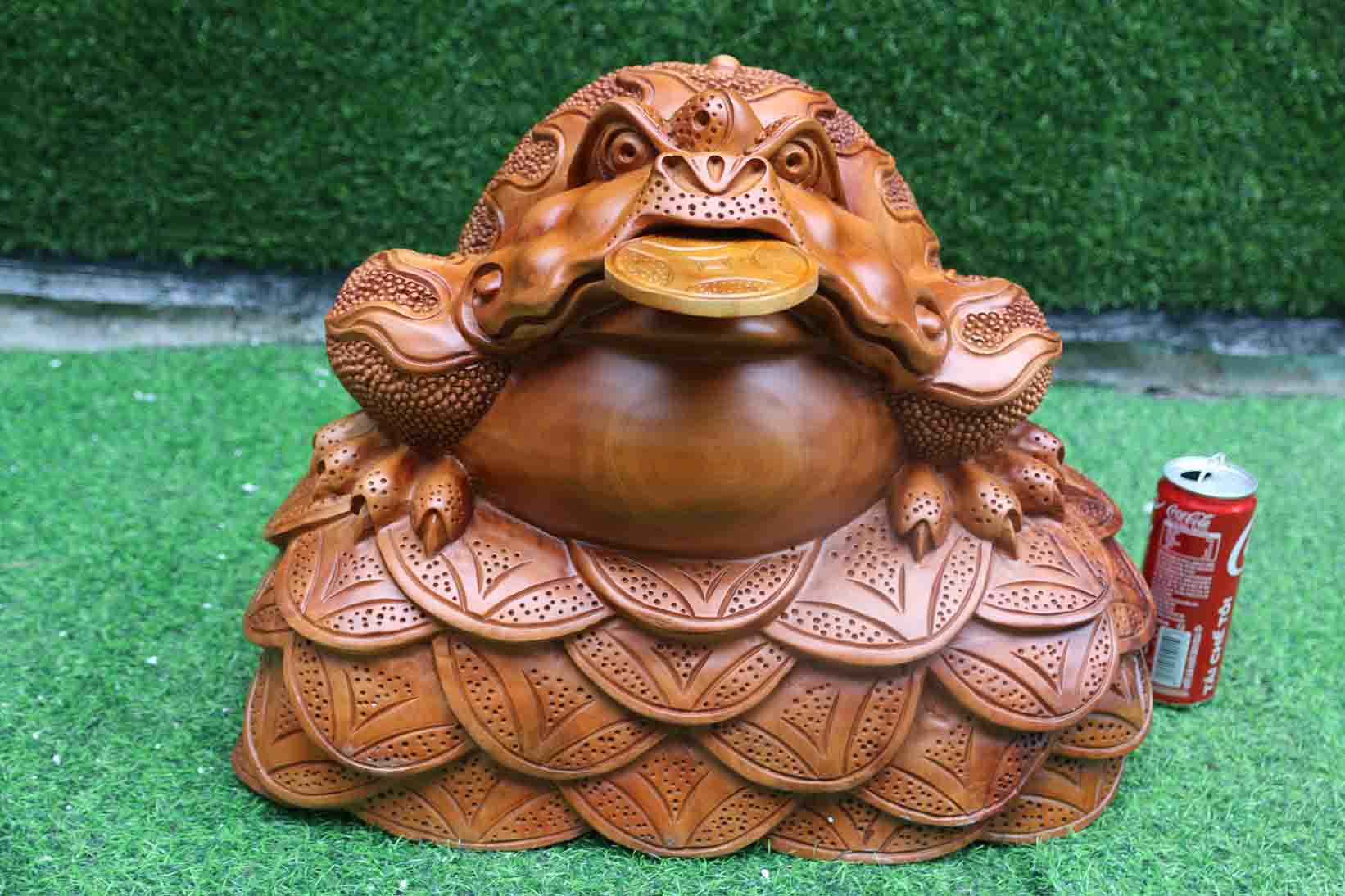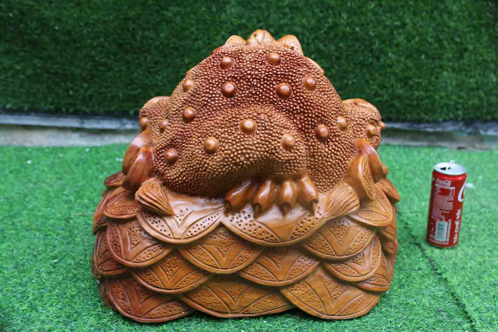 Đây là cụ cóc thiềm thừ to đẹp, do nghệ nhân làng nghề mộc Đông Giao - Hải Dương đục tay hoàn toàn. Tượng là liền khối, kiểu dáng đẹp, bệ vệ, hoành tráng, phù hợp trưng tại phòng khách quy mô vừa và lớn.