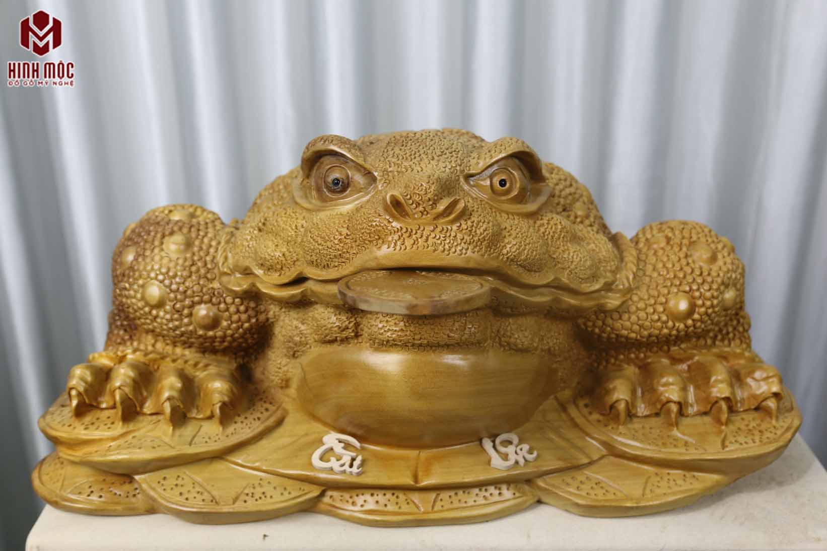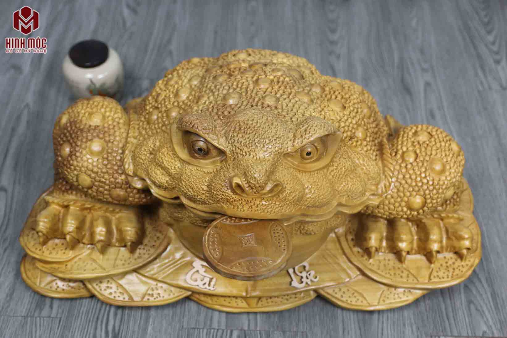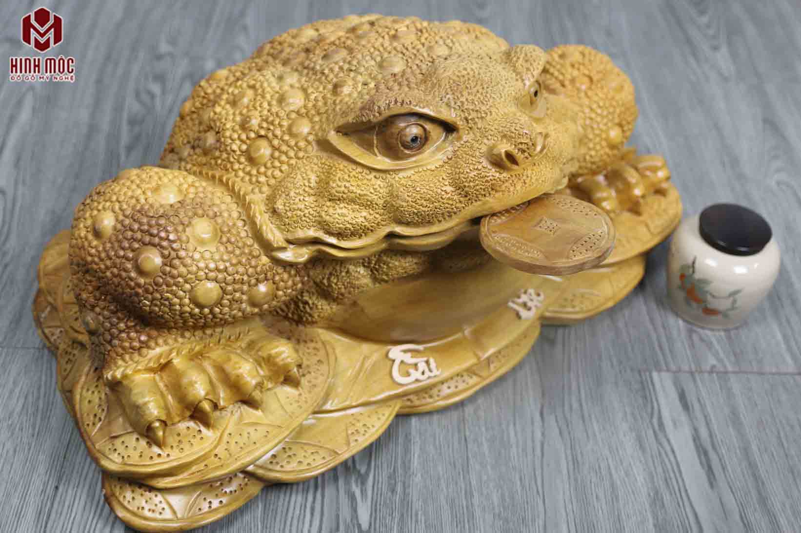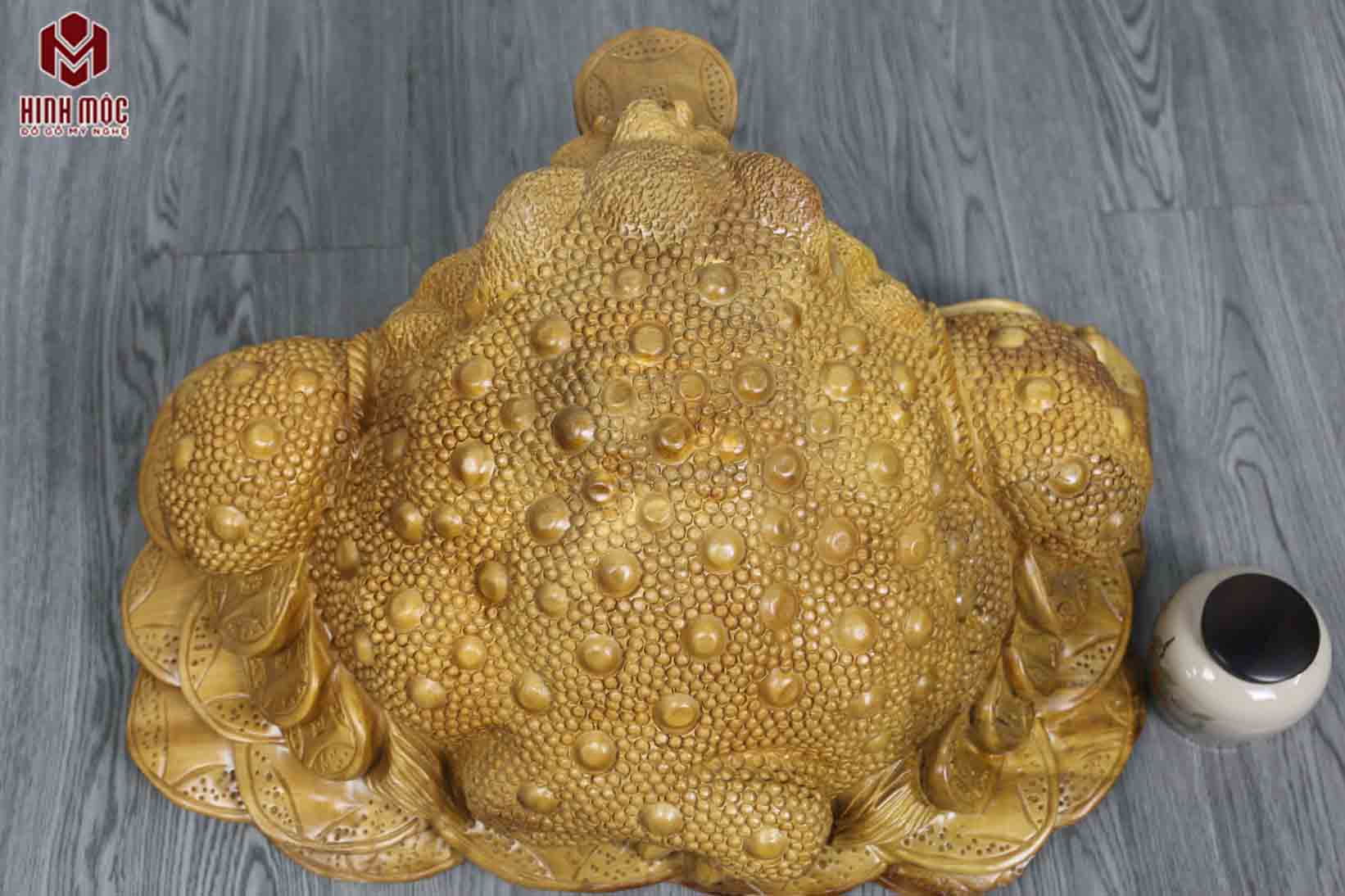 Đây là mẫu tượng to hiếm có, bởi ngày nay rất hiếm mới mua được gỗ đủ để có thể tạo hình 1 bức tượng cóc phong thủy to đến vậy. Nên nhớ, đục tượng cóc thiềm thừ đòi hỏi cục gỗ phải lớn, dày, nặng thì mới tạo hình được.